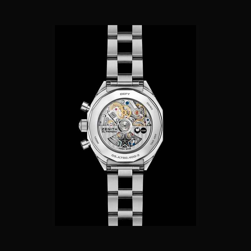 The DEFY Chronograph USM is housed in a compact 37.3 mm stainless steel case that stays true to the bold geometry of the original DEFY. Its octagonal shape is accentuated by a 14-sided bezel, while pump-style chronograph pushers enhance its vintage-inspired silhouette. The watch is paired with the iconic “ladder” bracelet, originally designed in 1969 by the renowned Gay Frères company exclusively for ZENITH. Water resistance is rated at 10 ATM, ensuring robustness to match its design integrity.