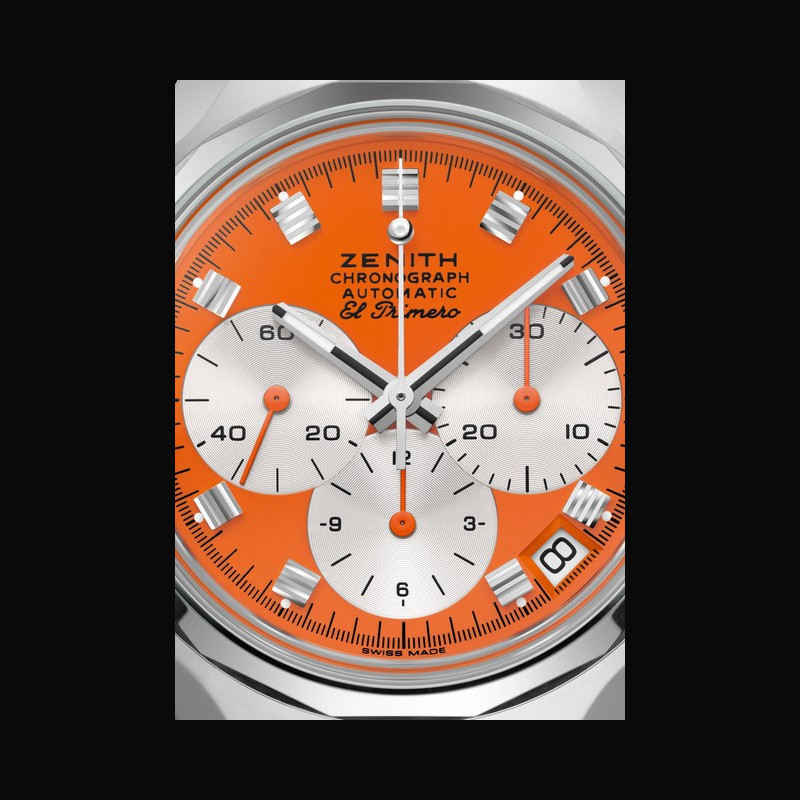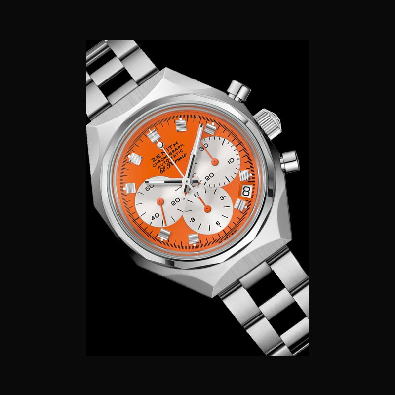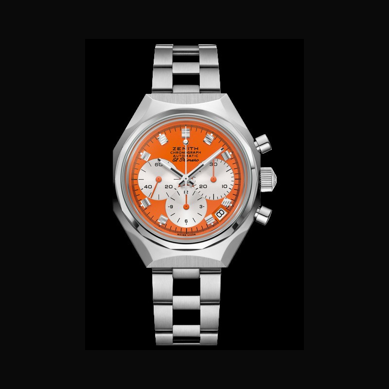 + More characteristics : | Movement Movement: El Primero 400 Frequency: 36,000 VpH (5 Hz) Power reserve: 55 hours Case Stainless Steel Dial USM Pure Orange Bracelet / Buckles Stainless steel “ladder” bracelet |
