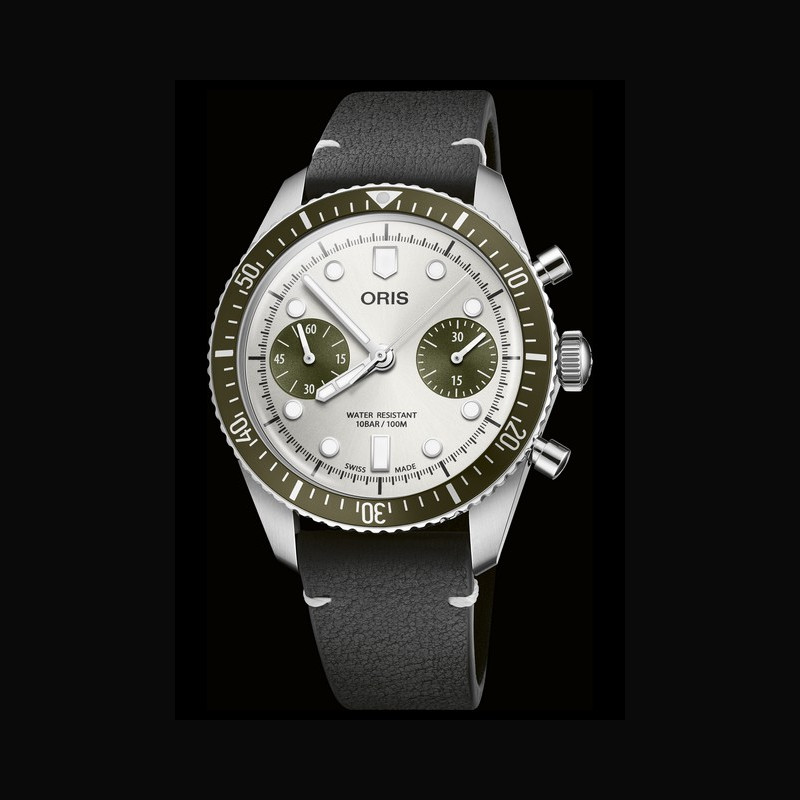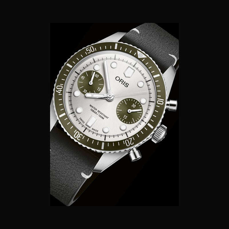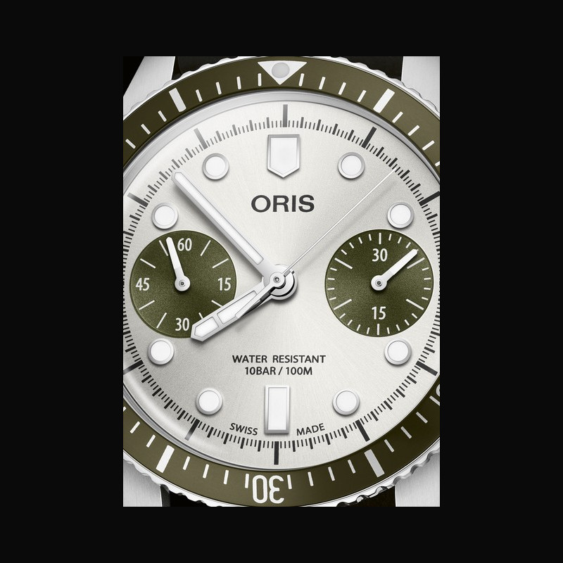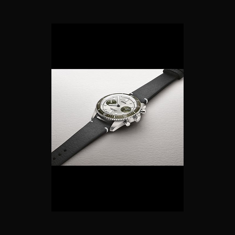 We’re delighted to introduce you to this suave ocean-green iteration on our evergreen Divers Sixty-Five Chronograph. At heart, the watch remains the same glorious neo-vintage design that has been echoing the spirit of our first everyday dive watch of 1965 since we breathed new life into it more than a decade ago. Note the vintage pump chronograph pushers, condensed numerals and shield-shaped index at 12 o’clock. This new 40.00 mm model takes the story forward with a stylish, calming blend of a sunray silver grey dial and green dial and bezel detailing. The colours are lifled from nature, particularly the deep ocean green, a shade that also picks up on the oaky green tones of the forested hills that surround our Hölstein factory. Behind the watch’s retro façade is a contemporary mechanical chronograph movement, Oris Calibre 771. As well as providing running-second and chronograph 30-minute subdial indications, it also delivers an impressive 62-hour power reserve. Water-resistant to 10 bar (100 metres), the watch is supplied on either a sustainably sourced Cervo Volante deer leather strap, or on a stainless steel bracelet.