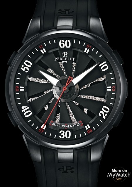 | + More characteristics : | Movement Automatic P-331 Double Rotor / Exclusive to Perrelet Open-worked black Perrelet rotor Dial Skull design set with diamonds beneath the black Turbine 210 diamonds |
