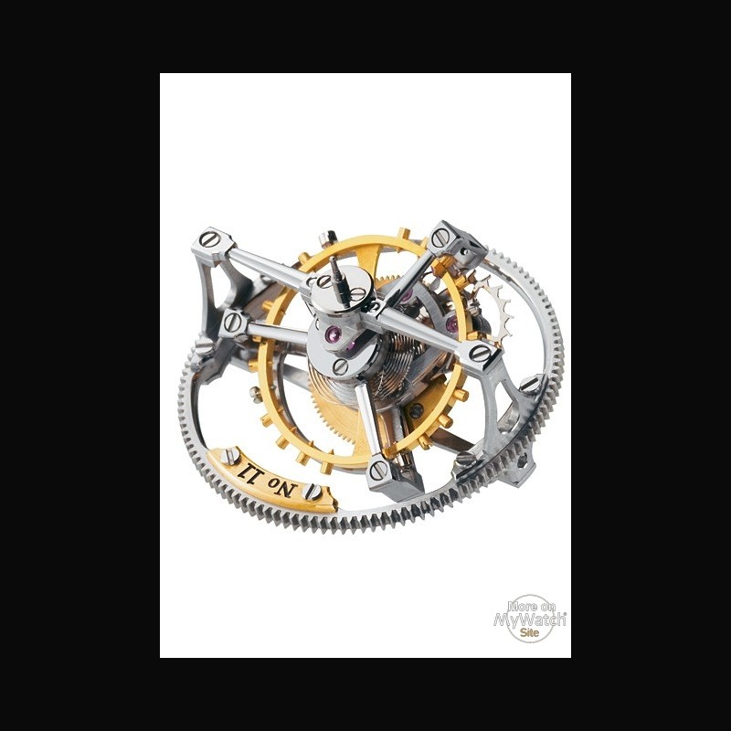 | More characteristics : | 30 ° inclined Double Tourbillon Outer Tourbillon 4-minute rotation indicator Movement 304 parts 2 Tourbillon cages : 128 parts Weight of the two cages : 1.17 g 39 jewels Olive-domed jewels in gold chatons Power reserve : 72 hours Frequency : 21 600 vibrations/hour Rapid rotating twin barrels one of which equipped with a slipping spring so as to avoid excess tension Balance wheel free sprung balance with white gold mean-time screws Main Plates in nickel silver with fine circular graining centred around the Tourbillon. finished in “jade gold” Bridges Hand-Frosted nickel silver. finished in «jade gold» Involute circle profile Conical gearing with corrected profile Inner Tourbillon Outer Tourbillon Crown in gold with engraved and black lacquered GF logo Raised polished engraving of the name of the Invention on a hand-punched background Gold security screws Three-dimensional lugs secured Hand-engraved individual number Hand-sewn strap Folding clasp engraved with the Greubel Forsey logo |