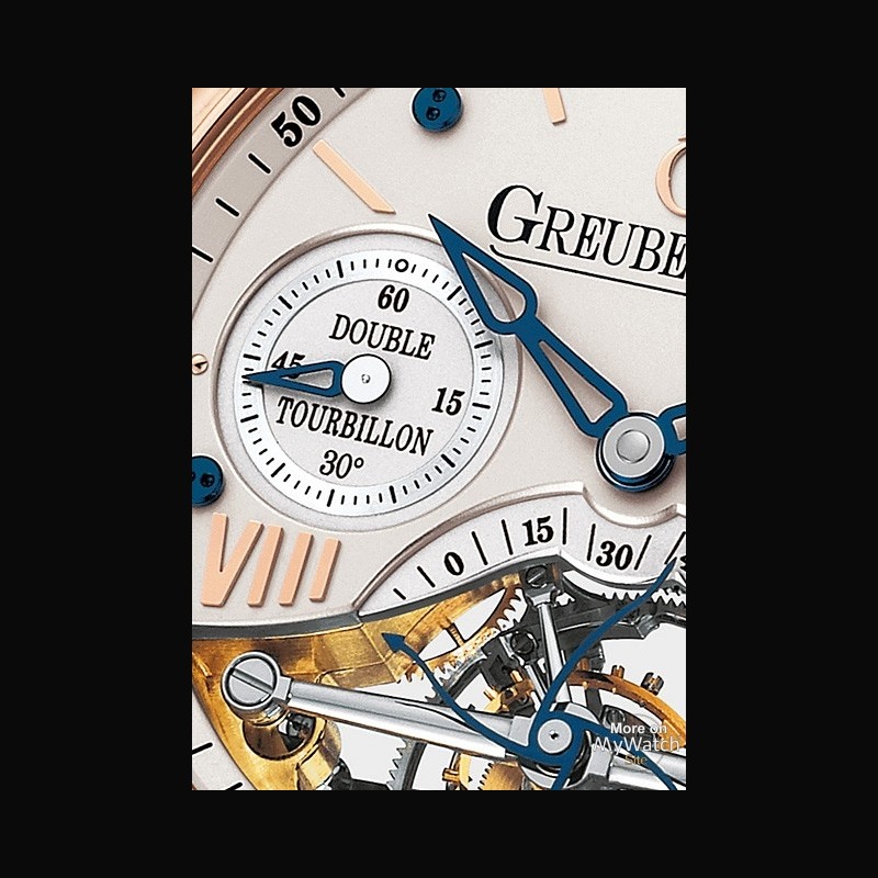 To facilitate the best view of the mechanical ingenuity and nobility of the new mechanism, the architecture of the movement and the dial arrangement offer an immediate and global vision of this fascinating subject, the ballet of a pair of Tourbillon cages appearing to cradle the balance system.