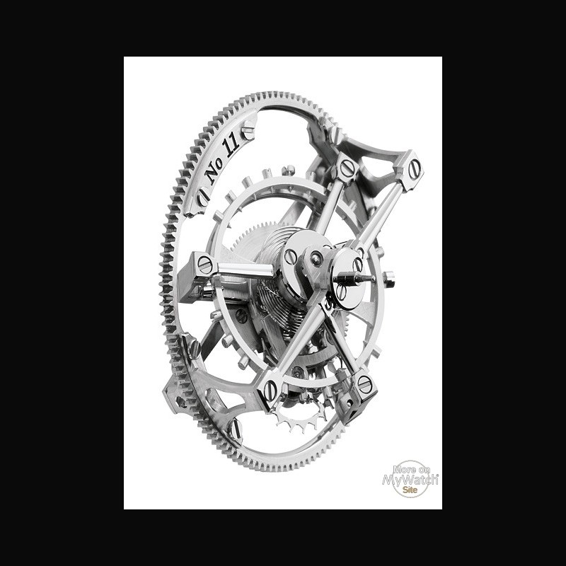 To facilitate the best view of the mechanical ingenuity and nobility of the new mechanism, the architecture of the movement and the dial arrangement offer an immediate and global vision of this fascinating subject, the ballet of a pair of Tourbillon cages appearing to cradle the balance system.