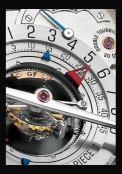 | + More characteristics : | Off-centred Double Tourbillon 30° Outer Tourbillon 4-minute rotation indicator Inner Tourbillon 60-second rotation indicator Hours and minutes display Movement 388 parts 2 Tourbillon cages : 128 parts Weight of the two cages : 1.17 g 38 jewels Olive-domed jewels in gold chatons Power reserve : 72 hours Frequency : 21 600 vibrations/hour Series-coupled fast-rotating double barrels. equipped with a slip-spring to avoid excessive tension Balance wheel Free sprung balance with white gold mean-time screws Main Plates Spotted and frosted nickel palladium Bridges frosted and gold-finished nickel silver“Message from the Inventor Watchmakers” text in relief on a gold plate Involute circle profile Conical gearing with corrected profile Inner Tourbillon Outer Tourbillon Raised polished engraving of the name of the Invention on a hand-punched background Gold security screws Hand-engraved individual number Hand-sewn strap Folding clasp engraved with the Greubel Forsey logo |