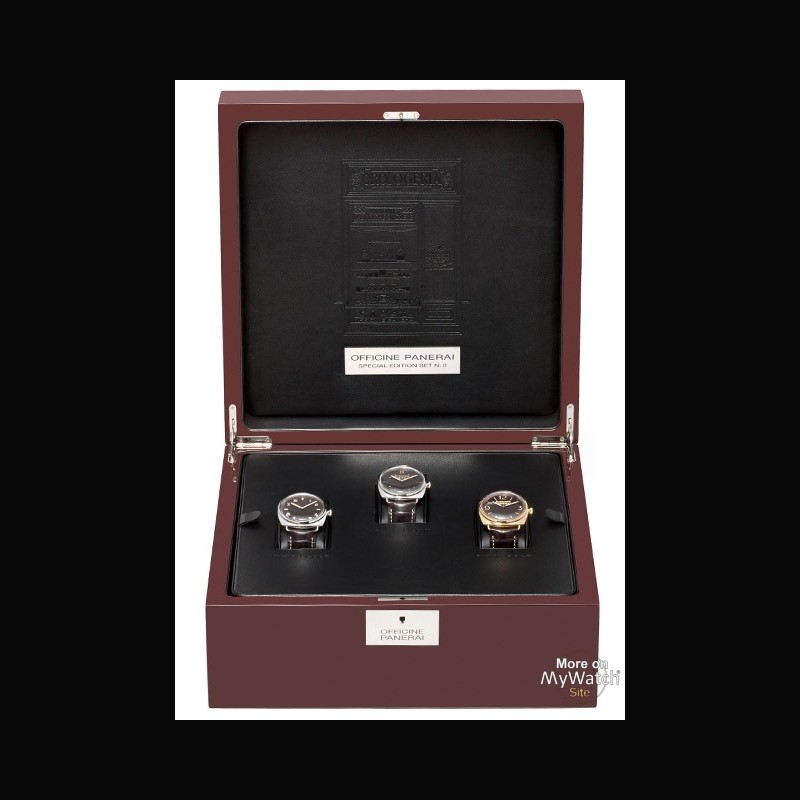 | + More characteristics : | Movement Power reserve 3 days 160 components 21 jewels. 16½ lignes in diameter 5.3 mm thick Two spring barrels Frequency of oscillation 3 Hz Incabloc® anti-shock device Strap PANERAI personalised large-size white gold buckle |
