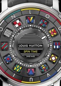 Positioned in the centre of the sapphire glass, a disc with clean radiating lines, bearing the inscription «Louis Vuitton Spin Time”, evokes the shape of a stylised earth globe.The delicate minute hand detaches poetically from this central circle.