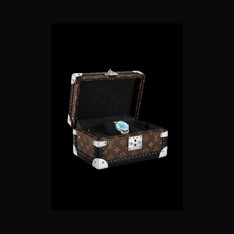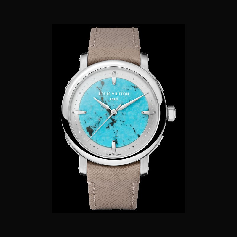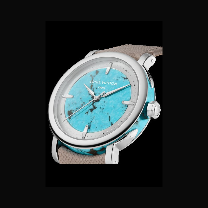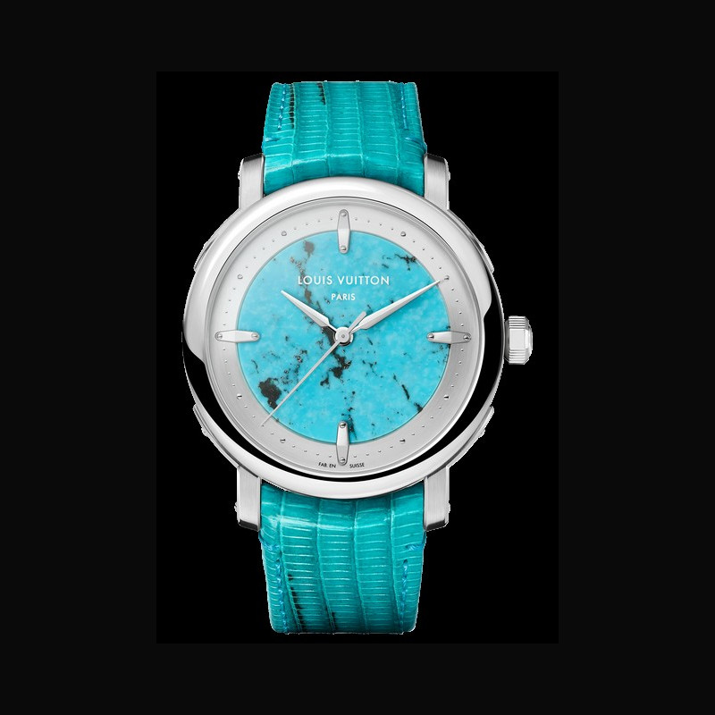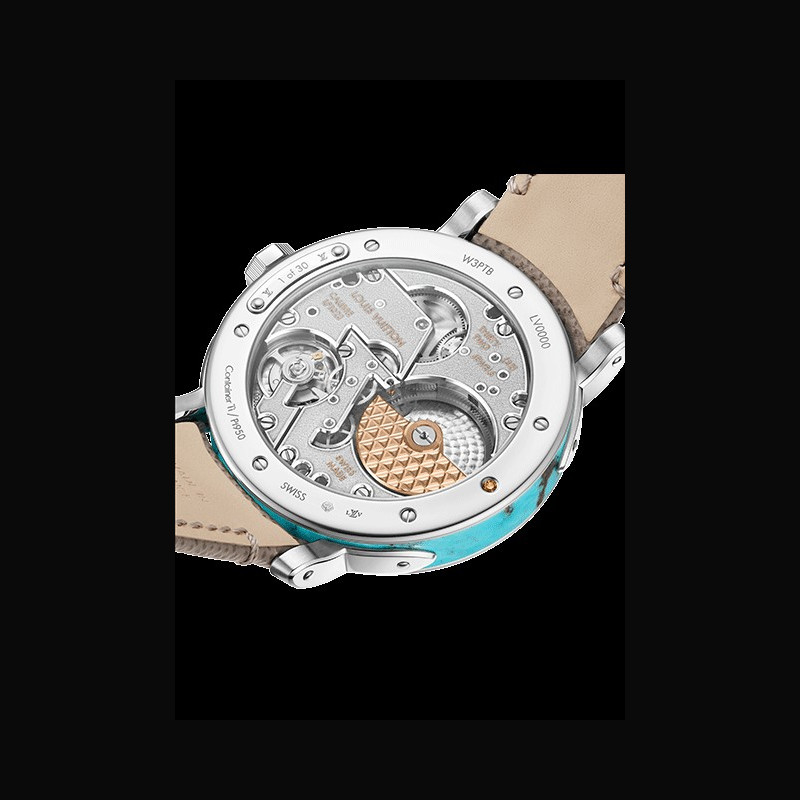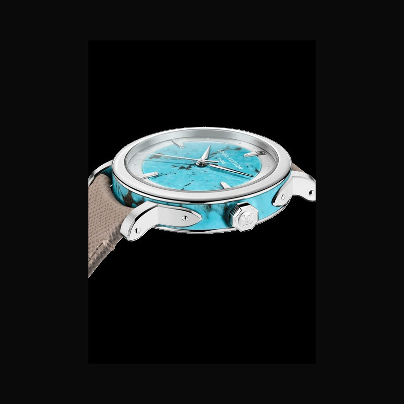 | More characteristics : | Movement Caliber LFT023: self-winding mechanical movement 22-carat rose gold micro-rotor 147 components 50-hour power reserve 28,800 vibrations/hour 32 jewels Certified chronometer by the Geneva Chronometric Observatory Case Platinum, polished bezel, brushed and polished lugs, turquoise middle case Dial Turquoise dial and silvery satin-finished tilted flange Strap / Buckles Arroyo grey saffiano calf leather and beige calf leather lining Platinum pin buckle with LOUIS VUITTON engraved signature |