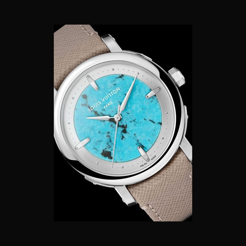| + More characteristics : | Movement Caliber LFT023: self-winding mechanical movement 22-carat rose gold micro-rotor 147 components 50-hour power reserve 28,800 vibrations/hour 32 jewels Certified chronometer by the Geneva Chronometric Observatory Case Platinum, polished bezel, brushed and polished lugs, turquoise middle case Dial Turquoise dial and silvery satin-finished tilted flange Strap / Buckles Arroyo grey saffiano calf leather and beige calf leather lining Platinum pin buckle with LOUIS VUITTON engraved signature |