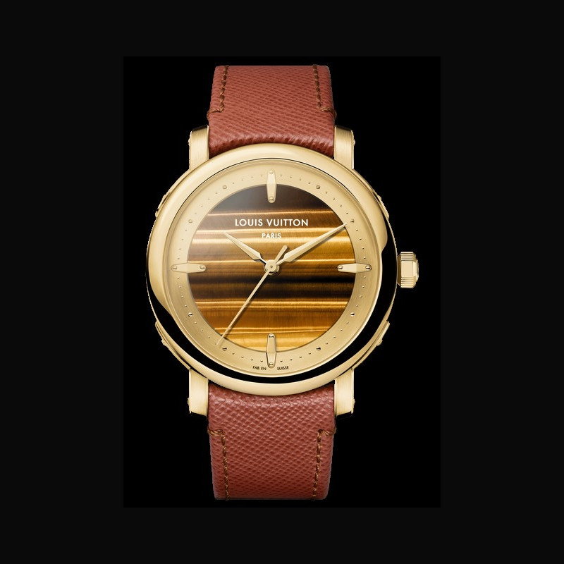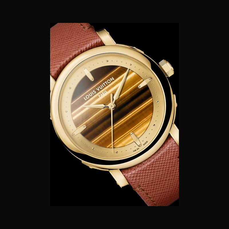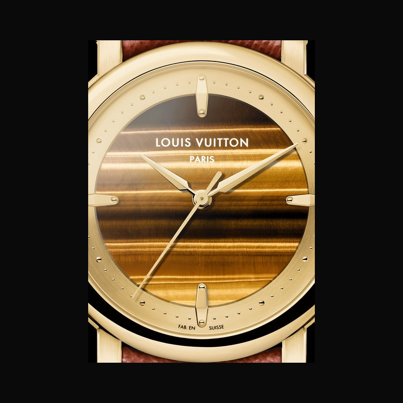 | + More characteristics : | Movement Caliber LFT023: self-winding mechanical movement 147 components 50-hour power reserve 28,800 vibrations/hour 32 jewels Case Yellow gold Dial Tiger’s eye dial and golden satin-finished tilted flange Strap / Buckles Savannah brown saffiano Calf Leather and black calf leather lining 18-carat yellow gold pin buckle with LOUIS VUITTON engraved signature |