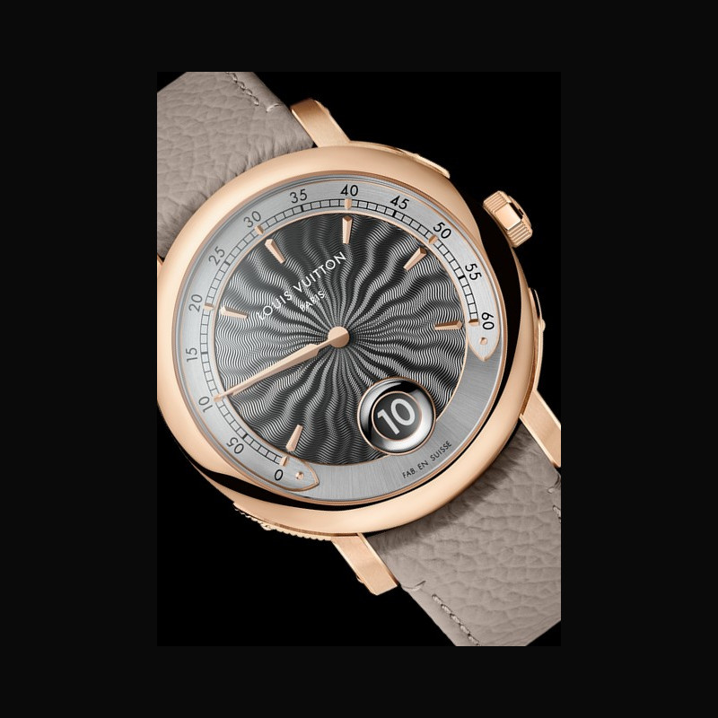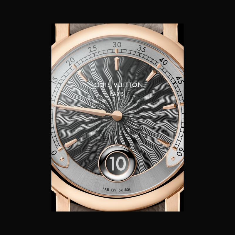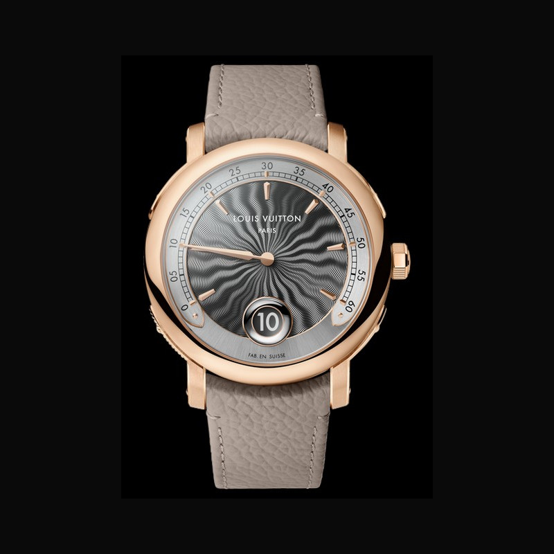 | More characteristics : | Movement LFT SO13.01 caliber: manual-winding mechanical movement developed by La Fabrique du Temps Louis Vuitton 432 components 80 hours of power reserve 21 600 vibrations/hour - 3Hz 48 jewels Case Rose gold 18K Dial Hand guilloché dial Strap / Buckles Beige calf leather strap, beige calf leather lining Buckle 18K rose gold folding buckle engraved with LOUIS VUITTON |