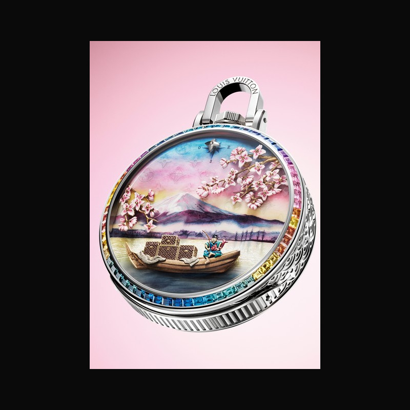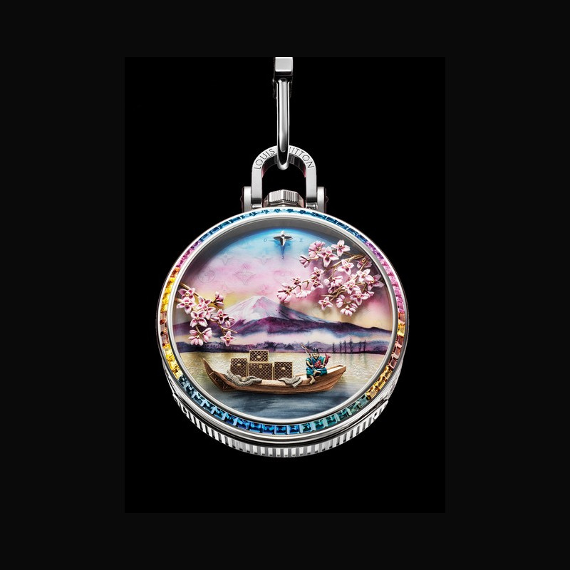 Continuing the savoir-faire and unparalleled handcraftsmanship within the pocket watch is the extraordinary Métiers d’Art found on the dial, and which richly brings to life the unique scene of the Escale au Mont Fuji. La Fabrique du Temps Louis Vuitton’s Master Engraver painstakingly engraves all the dial’s moving elements, many of which are extremely tiny with incredible, miniaturized details.