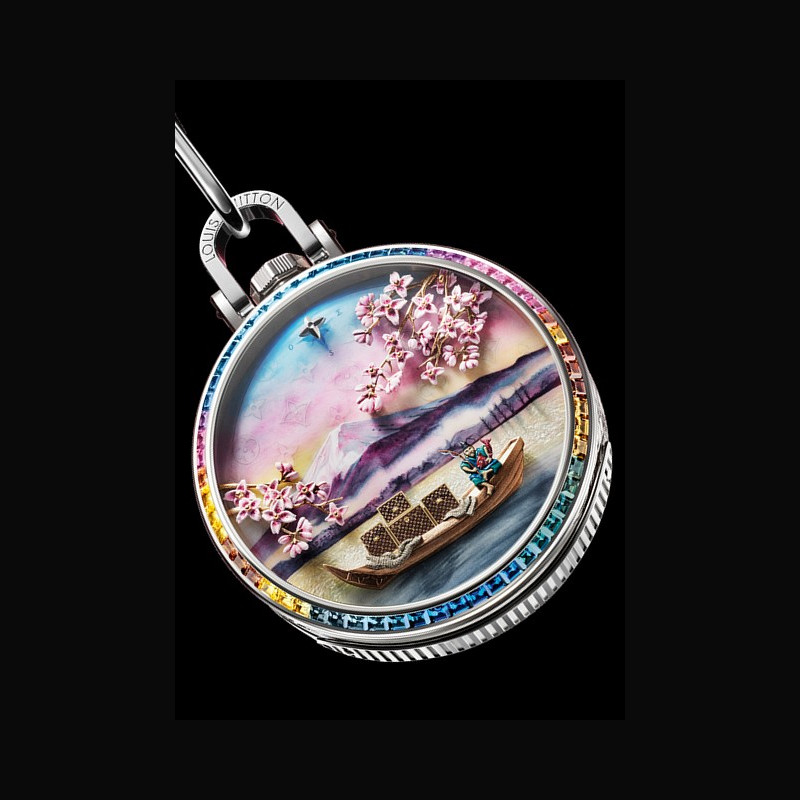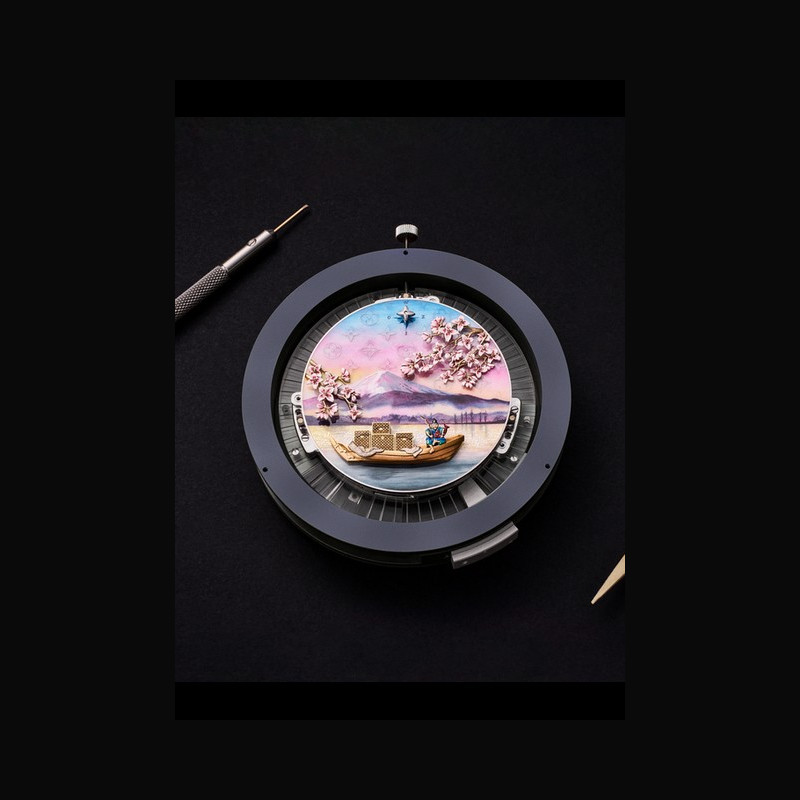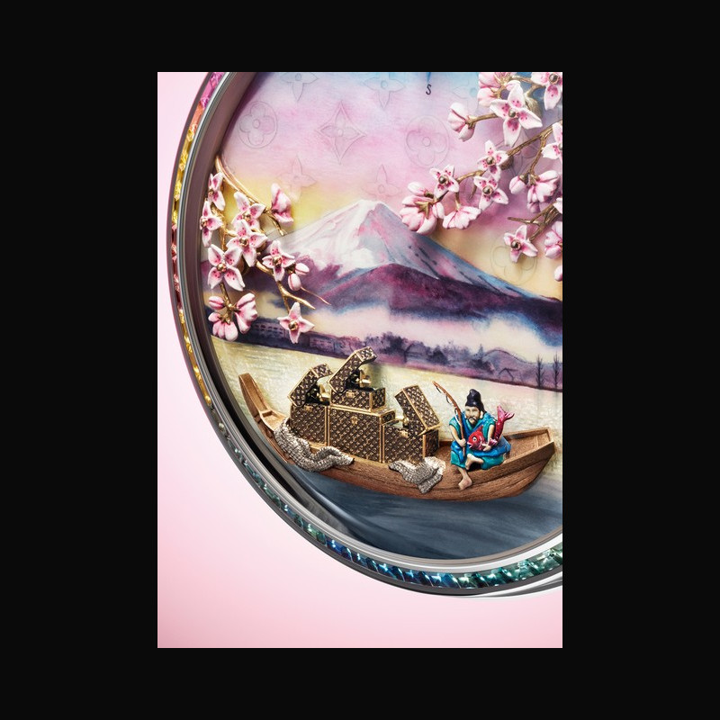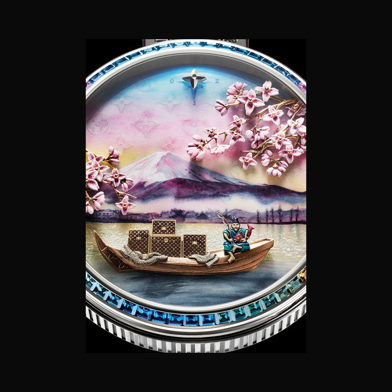 Framing the entire scene are Sakura cherry blossoms, which take its shape from the Louis Vuitton Monogram flowers. Sculpted in yellow gold and blooming with pink and red enamel, the flowers are further animated with emotion from the automata, swaying gently in the wind. Finally, 60 baguette-cut sapphires are set on the bezel, each stone individually chosen to match the underlying scene, and set in color gradation to match the finished dial.