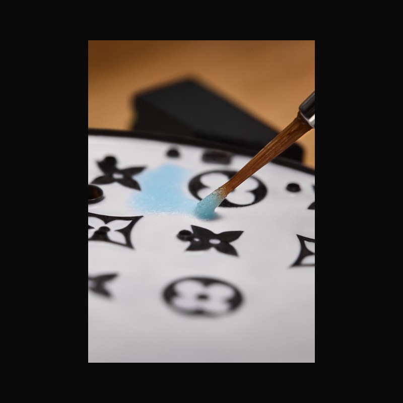 The Louis Vuitton Monogram flowers are then enameled in white and in miniature enamel, subtly integrating them into the gradient enamel background exuding a very special, soft and almost camouflaged look.