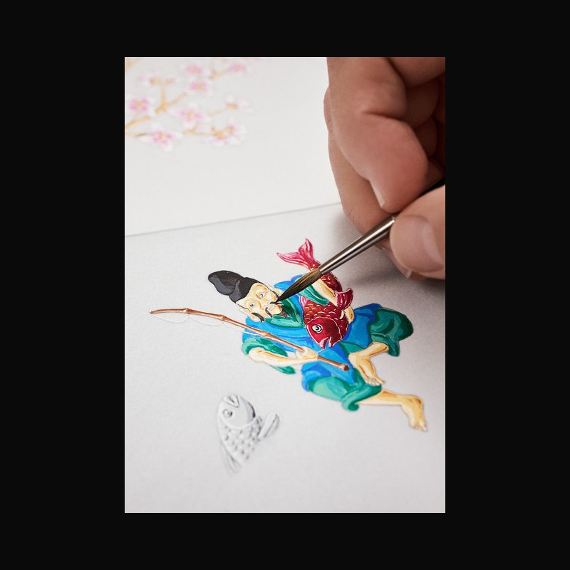 | Display : | Hand-engravings technique (cherry blossom flowers and branches; boat and its precious treasures; fisherman and compass rose) Handcrafted enamel techniques; including Grand Feu enamel with champlevé; paillonné; and miniature enamel |