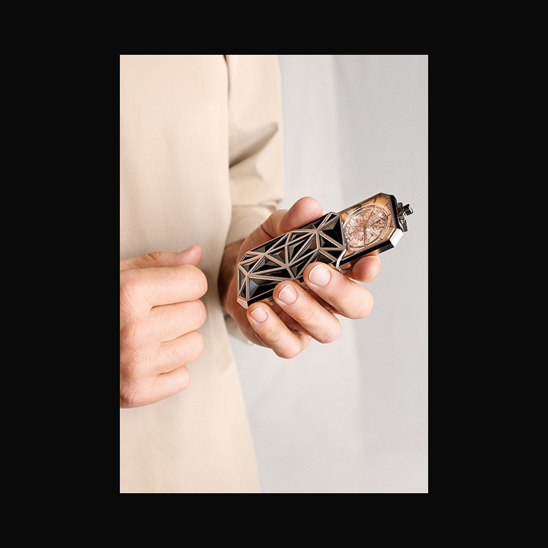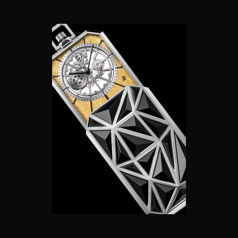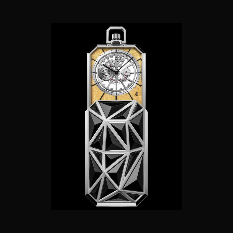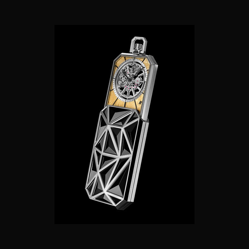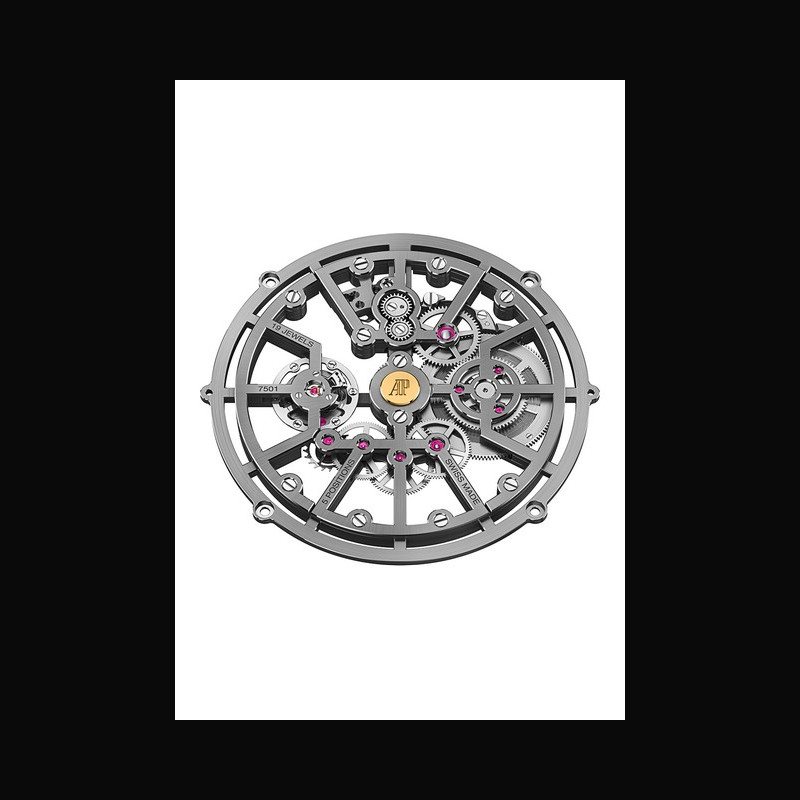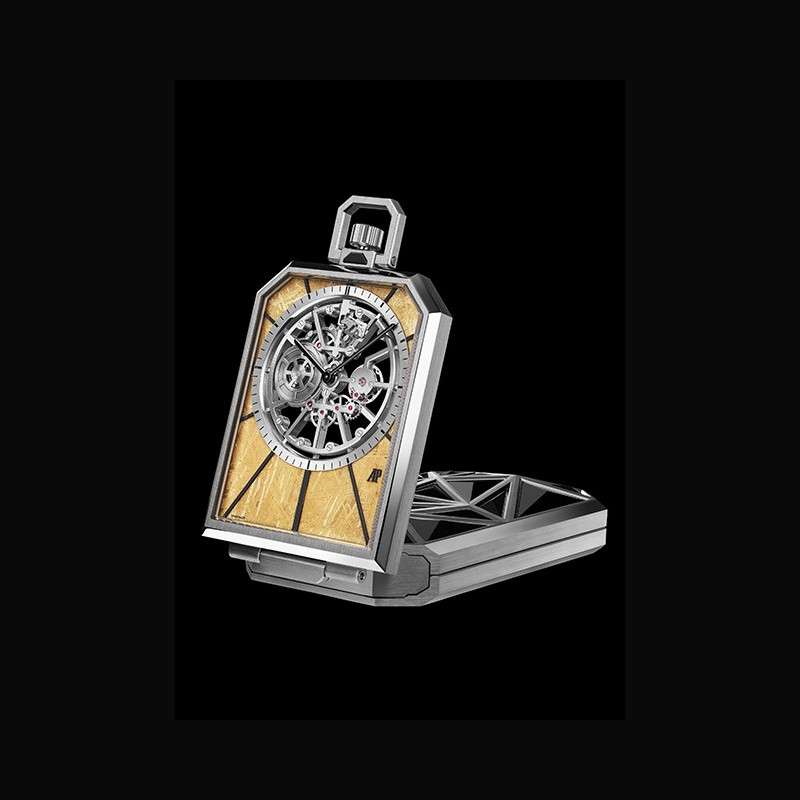 The second timepiece, Établisseurs Nomade, pays tribute to watches designed to be used in a variety of ways. Whether slipped in the pocket or placed on the table, this creation combines facetted metal – titanium or gold – with meticulously selected natural stones. Stones are fragile and require delicate craftsmanship to obtain the desired shape. The lapidarist saws, refines and polishes them slowly until they fit perfectly. The watch offers three positions: closed, open or pendulum. It comes with a specially designed chain in titanium or in gold. Calibre 7501 is the true hero of the timepiece. Based on the extra-thin Calibre 7121, which was launched in 2022, it is skeletonised using a hacksaw – a traditional fine handsaw. Playing on transparency and symmetry, the movement is punctuated with bridges that act as hour-markers to indicate the passage of time. Hand-skeletonisation is an exacting skill that only a few watchmakers have mastered. This know-how, which requires precision and patience, particularly when polishing the angles by hand, has been preserved at Audemars Piguet since the 1930s. The outer dial is made of natural stone and slips into an architectural case made of a bevelled metal mesh and facetted stones. Five variations with different combination of stones will be available in 2026.