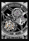| More characteristics : | Movement RD505SQ Calibre Flying Tourbillon at 7.30 (one rotation per minute) Inely adjusted in six positions Functions: Hours and minutes Decorations: Skeleton movement. rodium-plated. circular-grained plate. “Côtes de Genève” decoration. tourbillon carriage in the shape of a Celtic cross “Poinçon de Genève” finishings Number of parts: 165 Jewels: 19 Diameter: 16’’ Thickness: 5.70 mm Frequency: 3Hz (21.600 vp) Power-reserve: 60 hours Case Skeleton case. titanium black aluminium case band Dial Skeleton Black skeleton lange White minute-circle and Roger Dubuis transfers Titanium screws with SLN Skeleton hands in gold Black DLC treatment with SLN Strap Black rubber Titanium adjustable folding clasp |