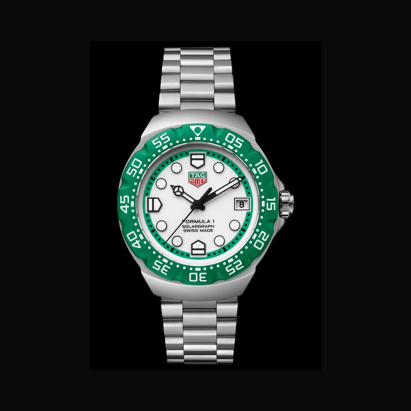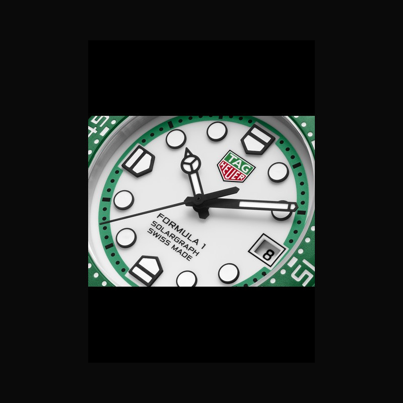 | Display : | Green flange with 60 second / minute scale Black lacquered indexes with white Super-LumiNova® by day and green luminescence by night Black lacquered polished hour and minute hands with white Super-LumiNova® by day and green luminescence by night Black lacquered central hand Green red white TAG HEUER printed logo 3 o’clock date FORMULA 1 SOLARGRAPH SWISS MADE printed |