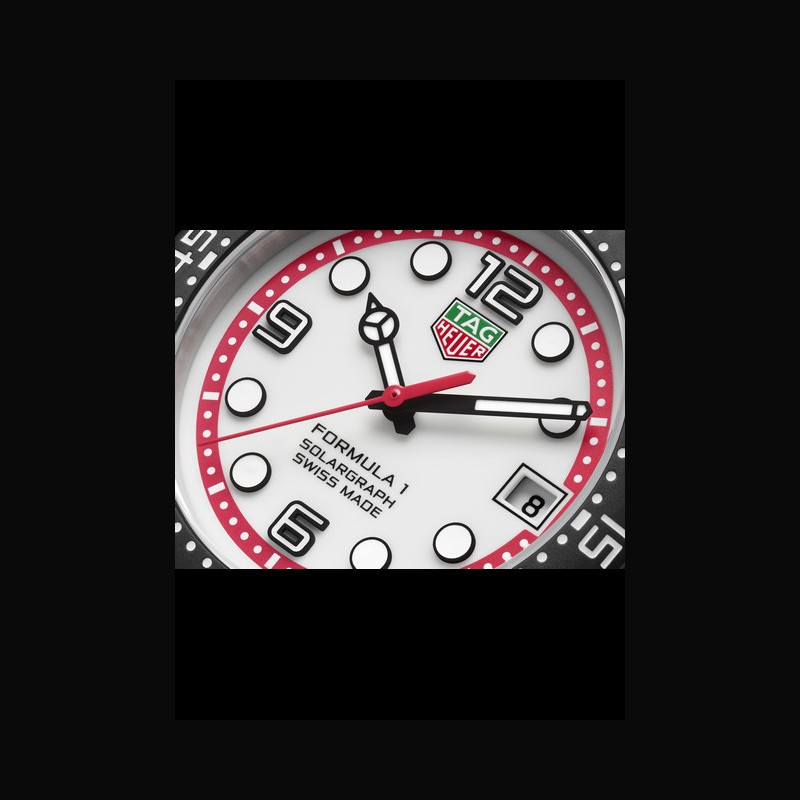 | Display : | Red flange with 60 second / minute scale Black lacquered applied indexes with white Super-LumiNova® by day and green luminescence by night Black lacquered hour and minute hands with white Super-LumiNova® by day and green luminescence by night Red lacquered central hand Green red white TAG HEUER printed logo 3 o’clock date FORMULA 1 SOLARGRAPH SWISS MADE printed |
