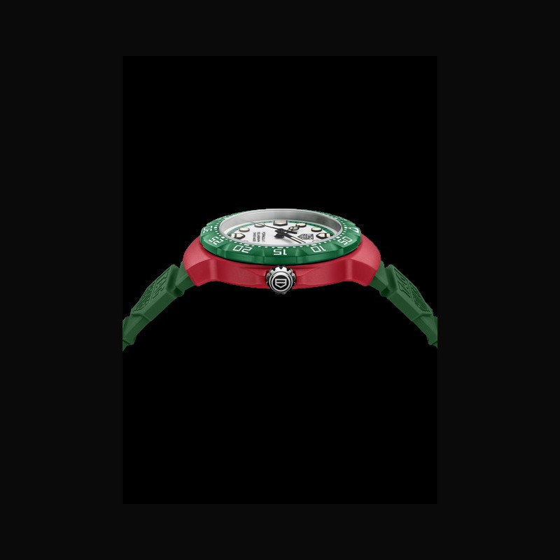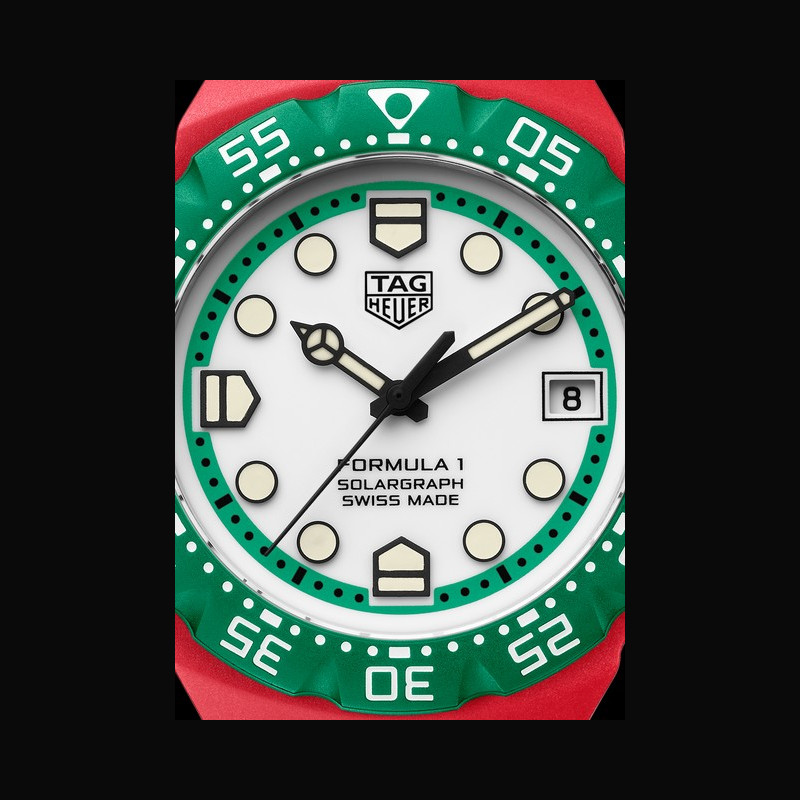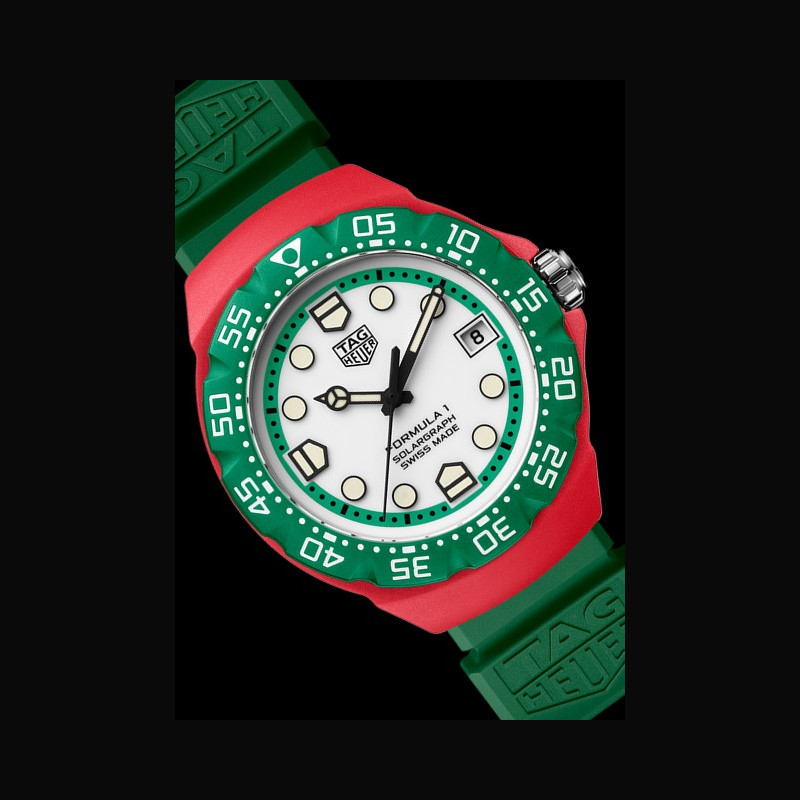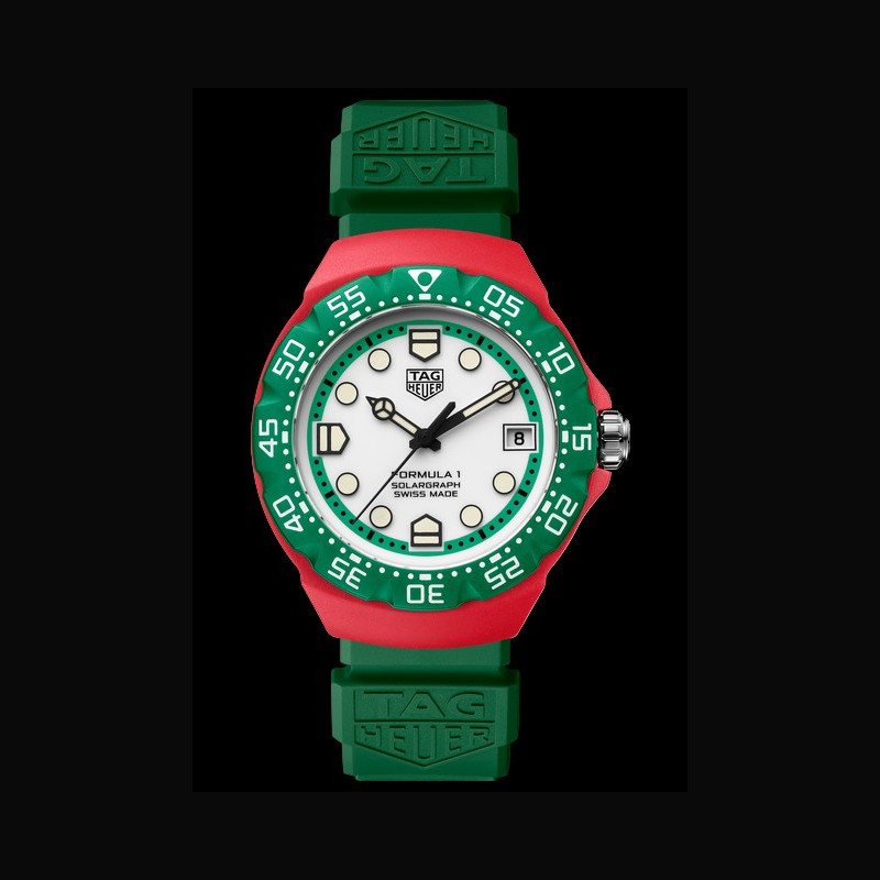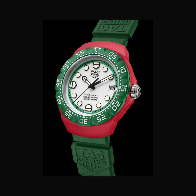 | + More characteristics : | Movement Caliber TH50-00 Case Red Bio-Polyamide case Lug-to-lug: 45,2 mm Dial White opalin dial Strap / Buckles Green rubber strap Steel pin buckle; TAG Heuer engraving Worldwide Availability 30.05.2025 (Barcelona GP) Pre-sale date: 27.05.2025, at 8.00 AM CET |