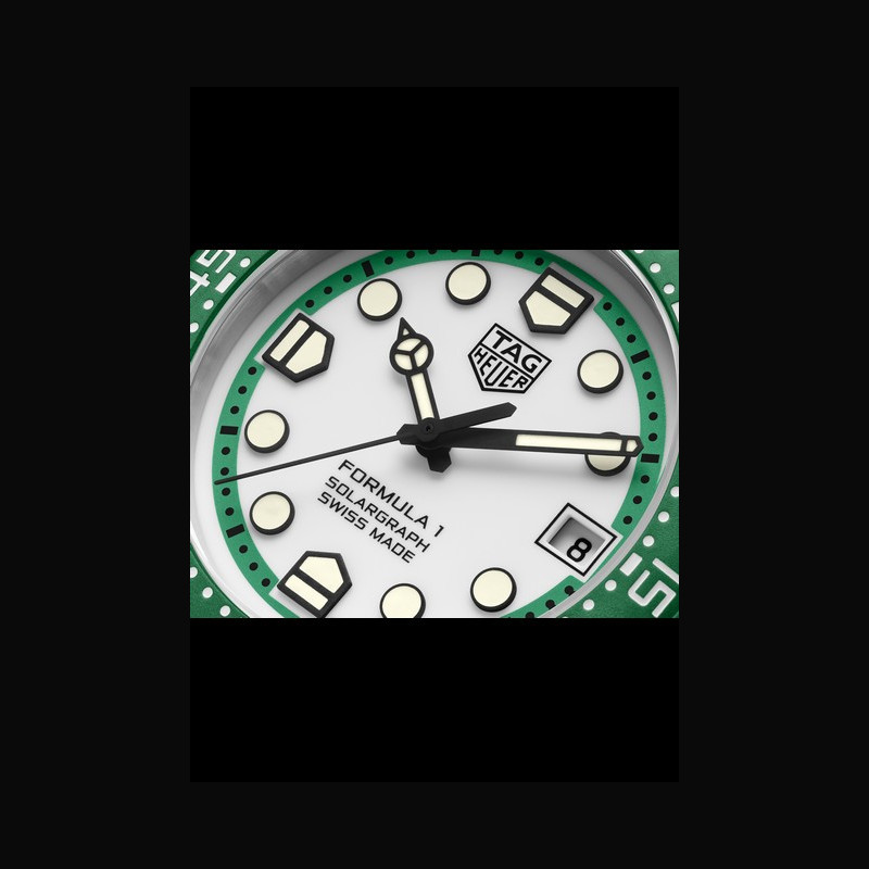 | Display : | Green flange with 60 second / minute scale Black lacquered indexes with eggshell Super-LumiNova® by day and green luminescence by night Black lacquered polished hour and minute hands with eggshell Super-LumiNova® by day and green luminescence by night Black lacquered central hand Black TAG HEUER printed logo 3 o’clock date FORMULA 1 SOLARGRAPH SWISS MADE printed |