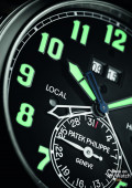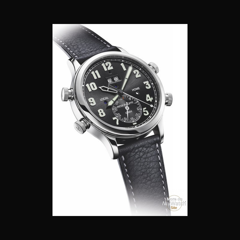 Patek Philippe is unveiling a new self-winding grand complication that adds a 24-hour alarm to its exclusive Travel Time display with two time zones; the alarm signal is struck by a hammer on a classic gong. To achieve this, the manufacture created a totally new integrated movement. Four patent applications were filed for the alarm mechanism. It is the result of five years of development work. The new caliber is presented in an elegant platinum case that reflects the Pilot Travel Time design.