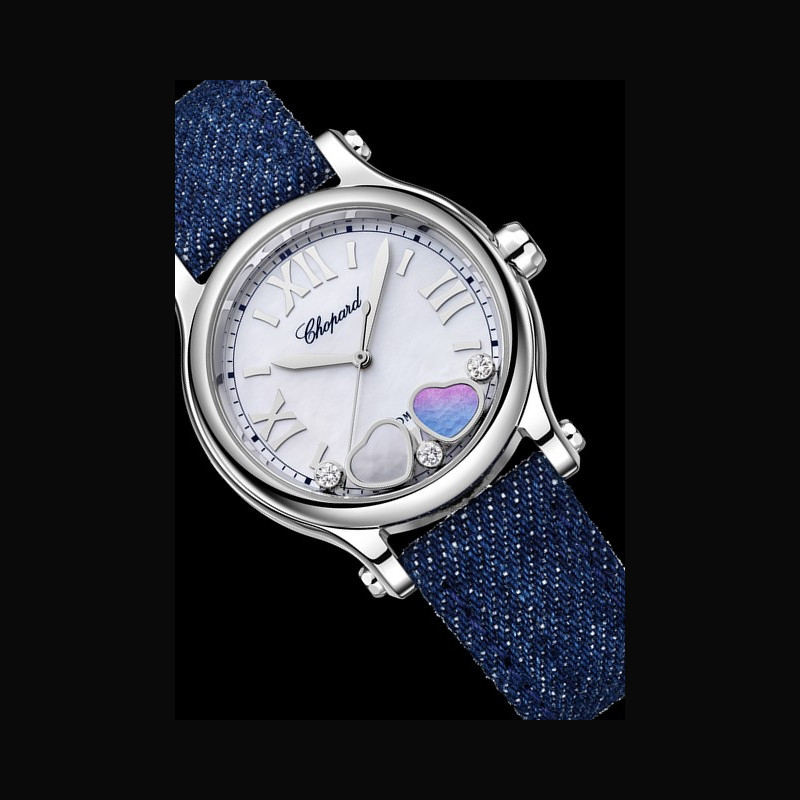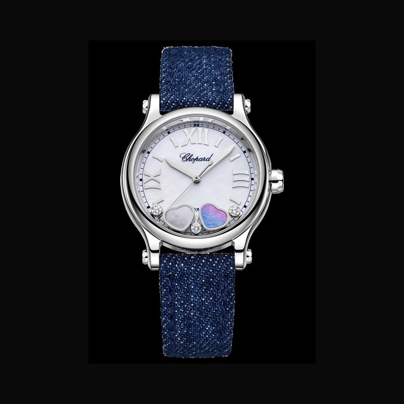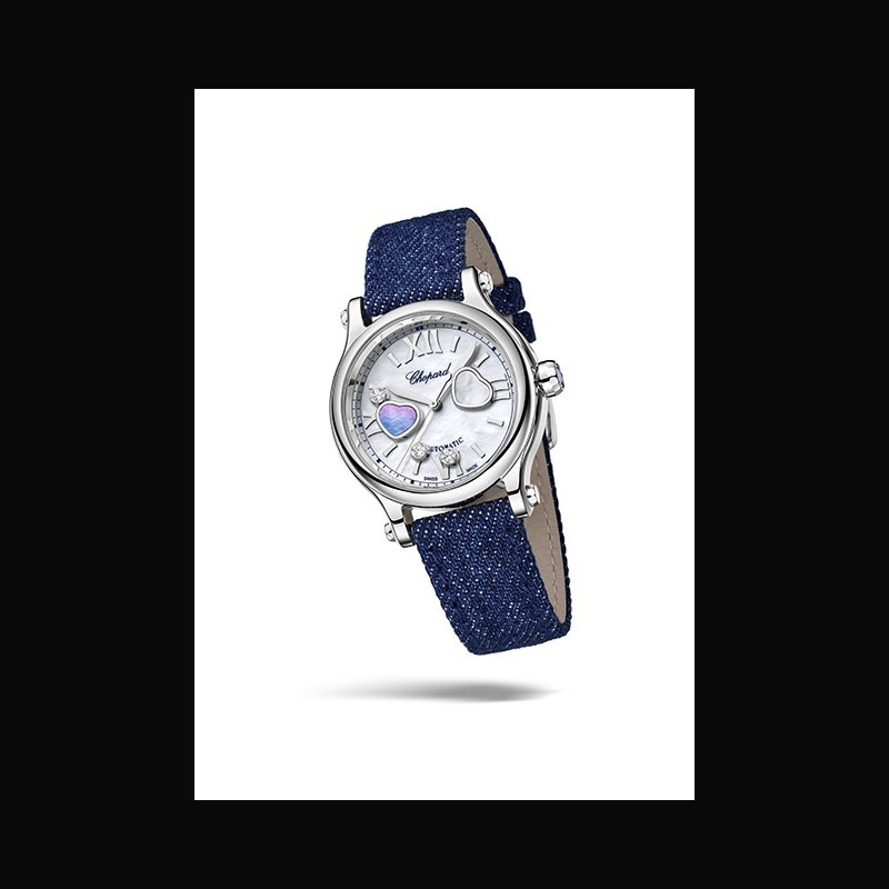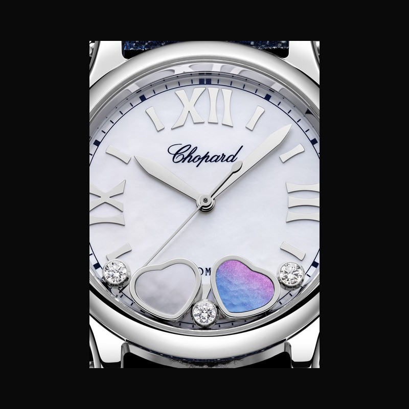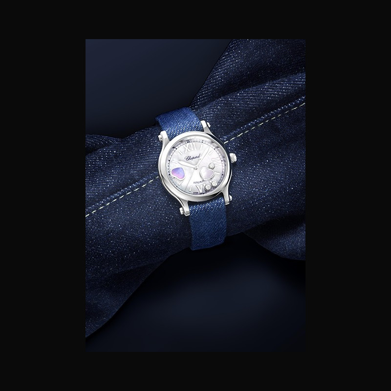 The new Happy Hearts timepiece is a sport-chic study in contrasts, where a strap of casual denim meets the nobility of mother-of-pearl, all framed in Lucent Steel™ – Chopard’s exclusive steel crafted with a recycling rate of 80%.