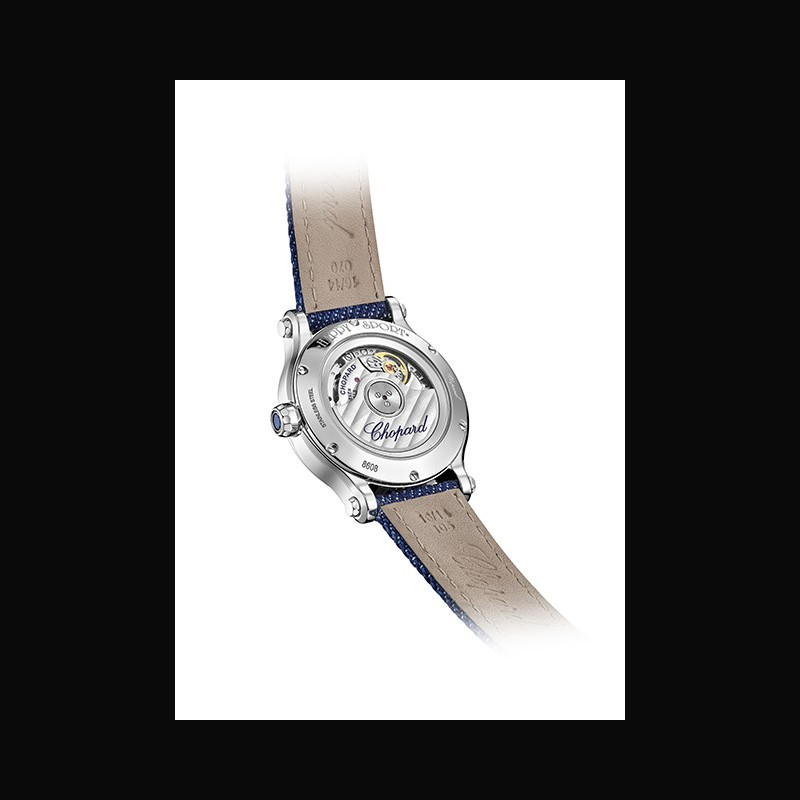 | Case peculiarity : | Facetted crown in Lucent Steel™ 5.50 mm Exhibition case-back with the Happy Sport logo |