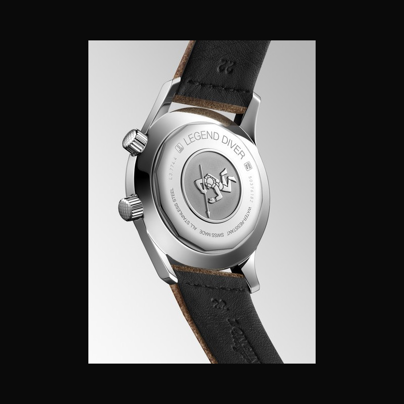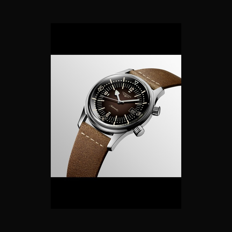 The blue or brown shaded dial features luminous hands, hour markers interspersed with luminescent squares and Arab numerals enhanced with Super-LumiNova® rectangles for optimum visibility. A reminder of the codes of the sport for which this watch was originally intended. And just like on the original model, the 42 mm case back is decorated with an embossed emblem of a diver. A structured blue or brown leather strap matches the colour of the dial. These new models of The Longines Legend Diver Watch come with a 5-year warranty.