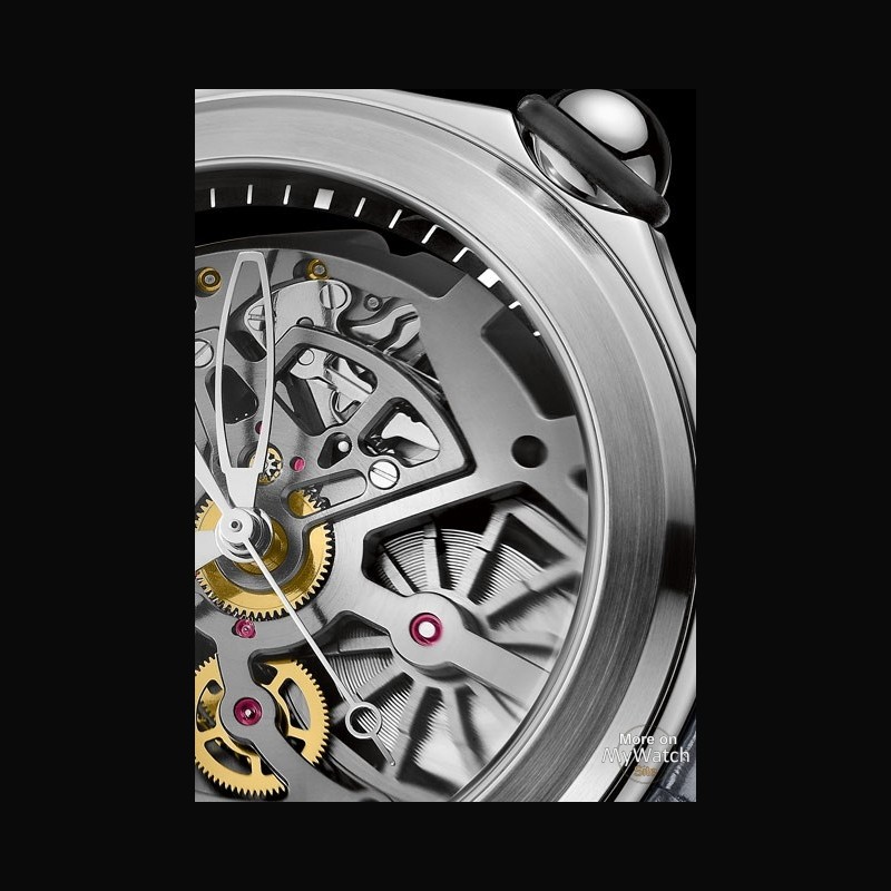 Part of the regular collection of timepieces, the third model in the Bubble collection does away with the dial entirely. A skeletonized movement takes its place, with the domed sapphire crystal providing a magnified view of the exposed wheels of the CO0082 self-winding movement.