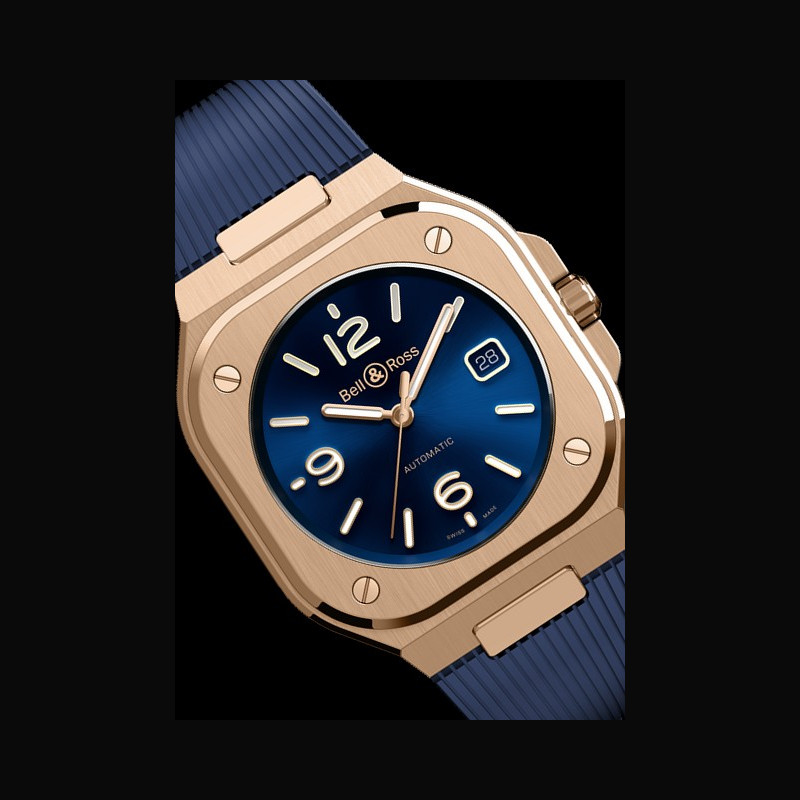 The BR 05 is already an iconic watch thanks to its square shape, its round dial ensuring optimum legibility, its broad dimensions, and the efficiency of its functional design. Made for the city, modern and comfortable, the BR 05 GOLD BLUE is a precious ally for urban explorers for their everyday life in the city. A dialogue of color and material for a timeless and distinguished piece.