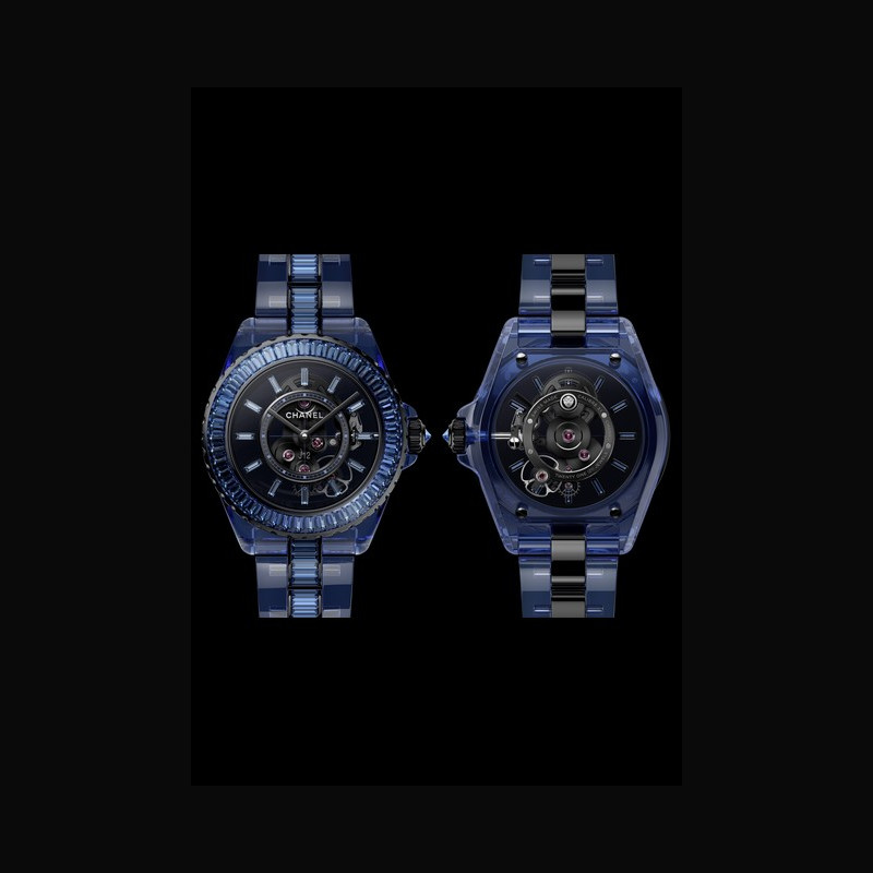 A tribute to transparency, the J12 BLEU X-RAY conjures a new shade of blue for this collection, inspired by the colours of the sea and the sky on a clear day. Over 1600 hours of work were required to sculpt the case and bracelet of this model from a single block of synthetic sapphire. Crafted in white gold, the bezel and links are set with 196 bright blue baguette-cut natural sapphires. For the ultimate detail, the Creation Studio ties white gold with black and creates an elegant contrast to this symphony of blues.