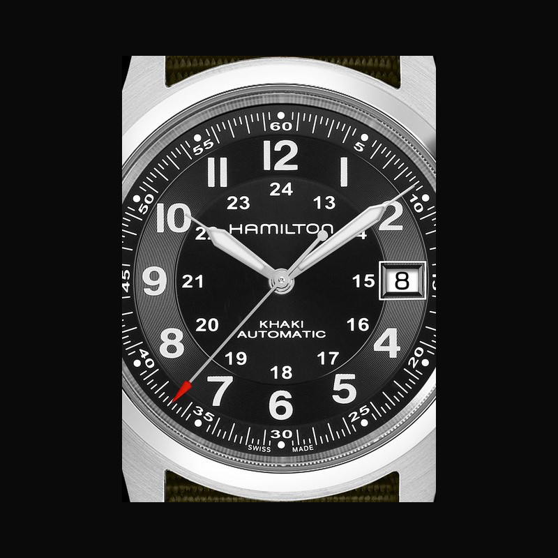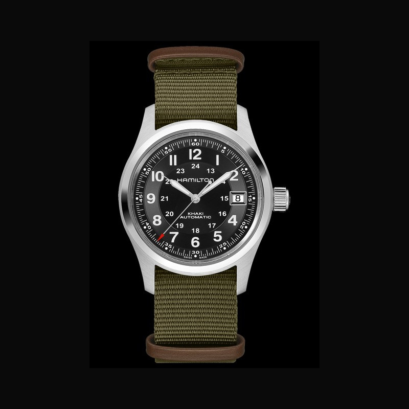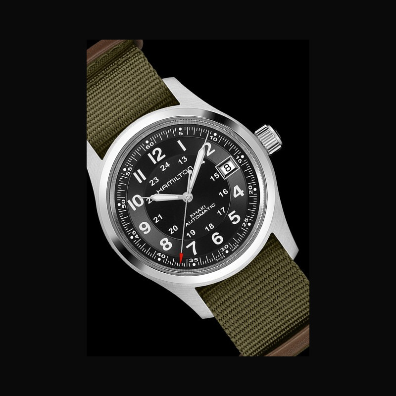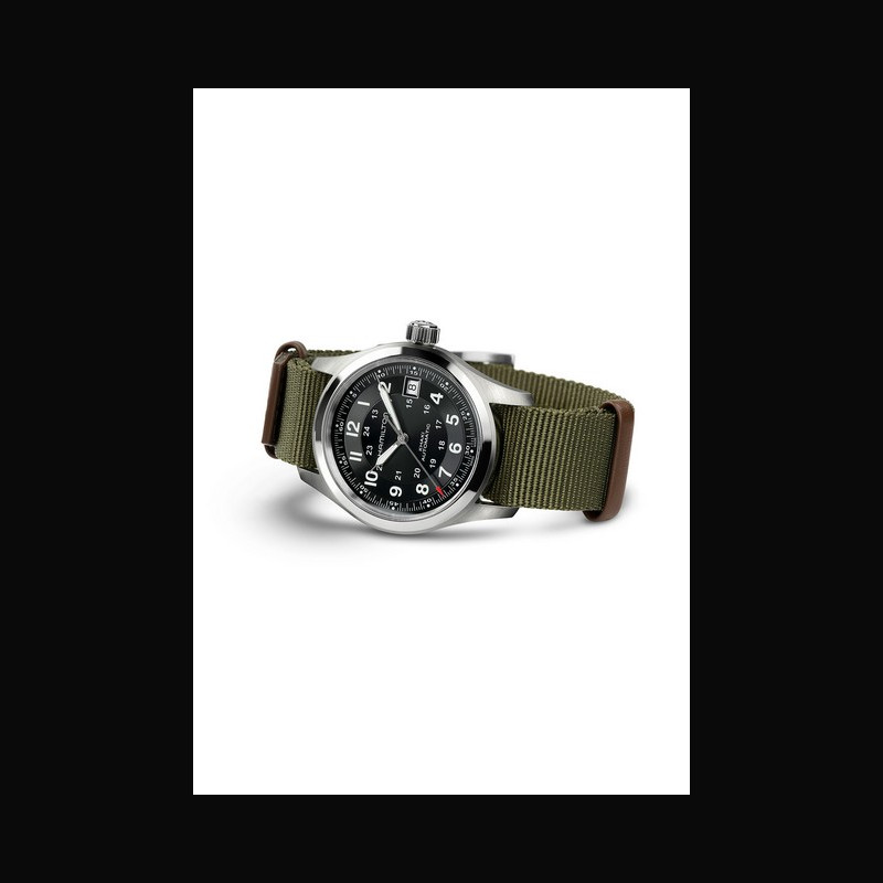 | + More characteristics : | Mouvement Mouvement H-10 à remontage automatique avec réserve de marche de 80 heures Boitier Acier inoxydable Largeur de l’entrecorne 20 mm Cadran Cadran noir aux finitions multiples Bracelet / Boucles NATO vert kaki |