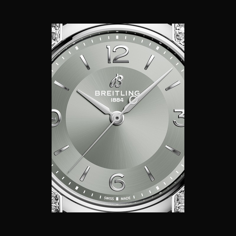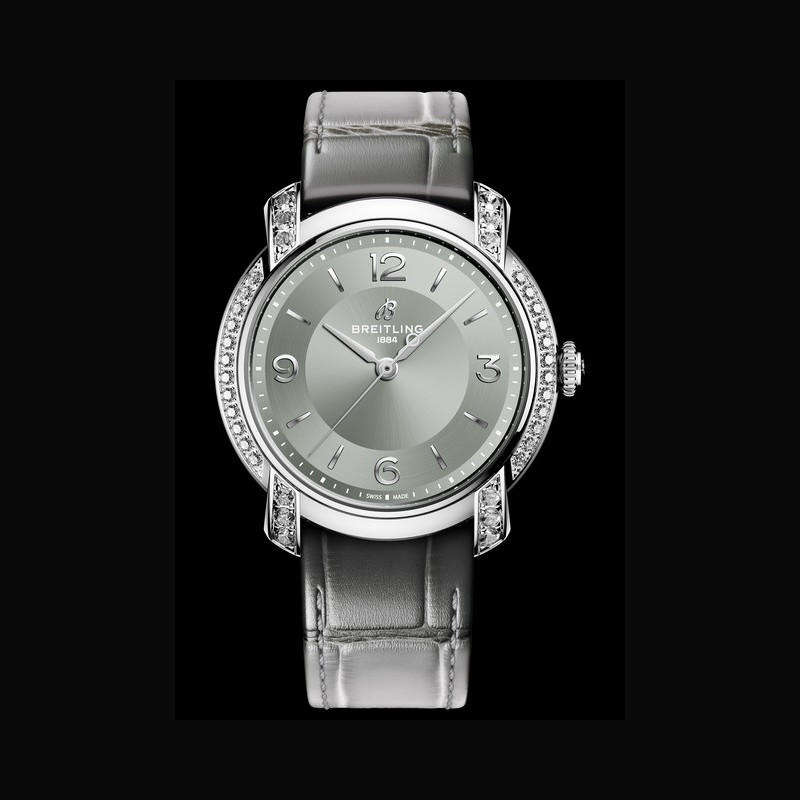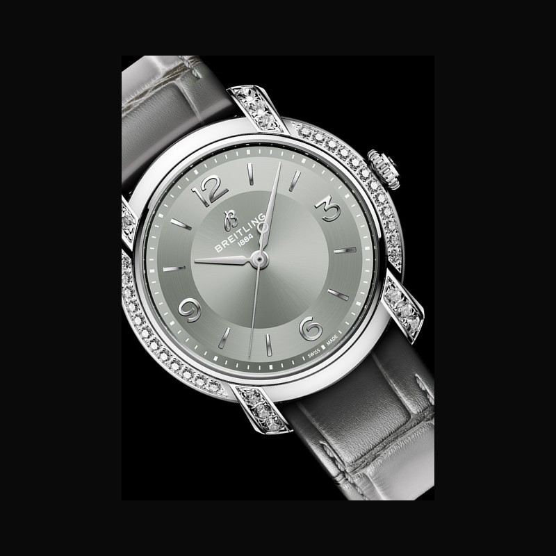 | More characteristics : | Movement Caliber: Breitling Caliber 10 Diameter: 25.60 millimeters Depth: 3.60 millimeters Winder: self-winding mechanical, bidirectional with ball bearing Power reserve: approximately 42 hours Balance frequency: 28,800 a/h or 4 hertz Case Stainless steel with lab-grown diamonds, or 18k gold Dial Dove grey Strap / Buckles Alligator-leather straps in gradient shades of dove grey with folding clasp (18/16mm) |