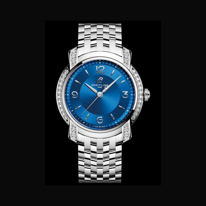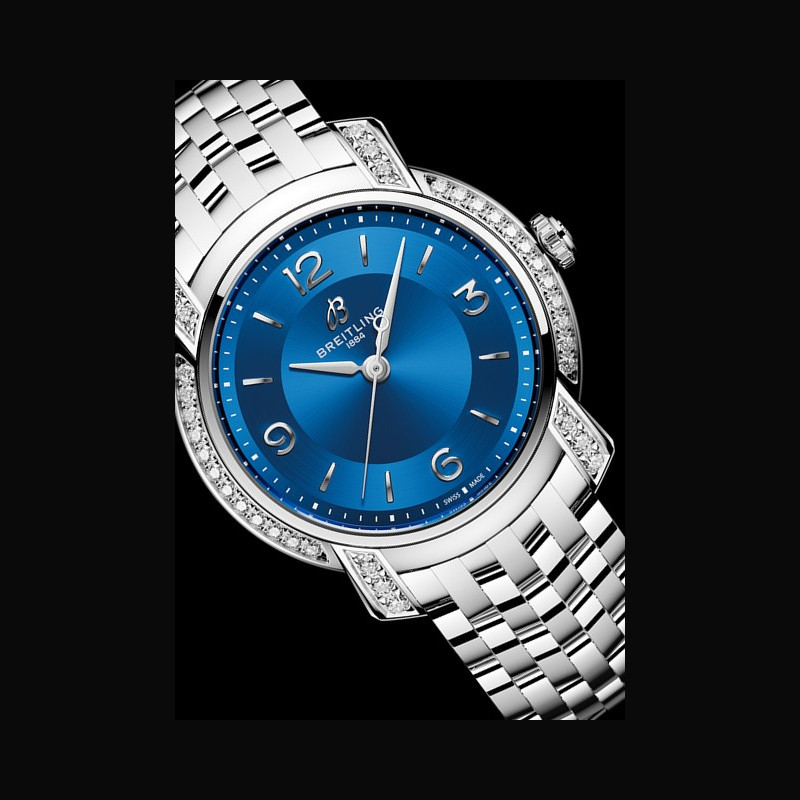 | More characteristics : | Movement Caliber: Breitling Caliber 77 Superquartz™ Diameter: 23.30 millimeters Depth: 3.22 millimeters Movement: thermocompensated Superquartz™ Battery life: approximately 3-4 years Case Stainless steel with lab-grown diamonds Dial Ink Blue Bracelet / Buckles Stainless steel seven-row Chevron bracelet with V-shaped pattern and folding clasp |