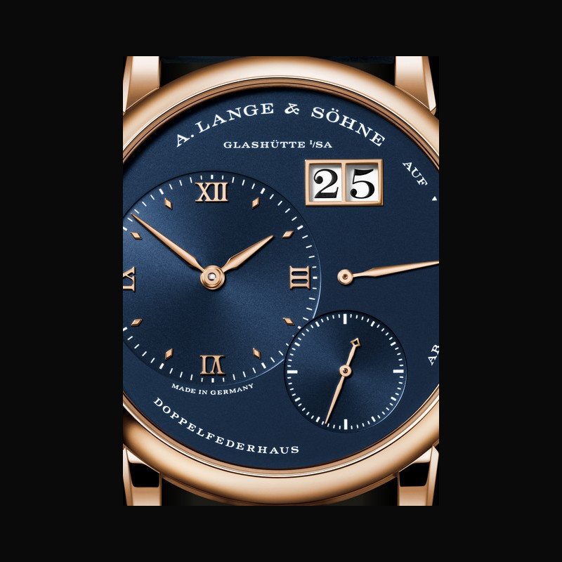 | More characteristics : | Movement Lange manufacture calibre L121.1, manually wound, crafted to the most exacting Lange quality standards, decorated and assembled by hand; precision-adjusted in five positions; twin mainspring barrel; plates and bridges made of untreated German silver; balance cock engraved by hand No. of movement parts 368 No. of jewels 43 No. of screwed gold chatons 8 Escapement Lever escapement Oscillation system Shock-resistant balance with eccentric poising weights; superior-quality balance spring manufactured in-house, frequency of 21,600 semi-oscillations per hour, precision beat adjustment system with lateral setscrew and whiplash spring Power reserve 72 hours when fully wound Movement dimensions Diameter: 30.6 millimetres; height: 5.7 millimetres Case 750 pink gold Dial 925 silver, blue Strap / Buckles Hand-stitched alligator leather, blue Prong buckle in 750 pink gold Limited edition 300 watches, edition number engraving |