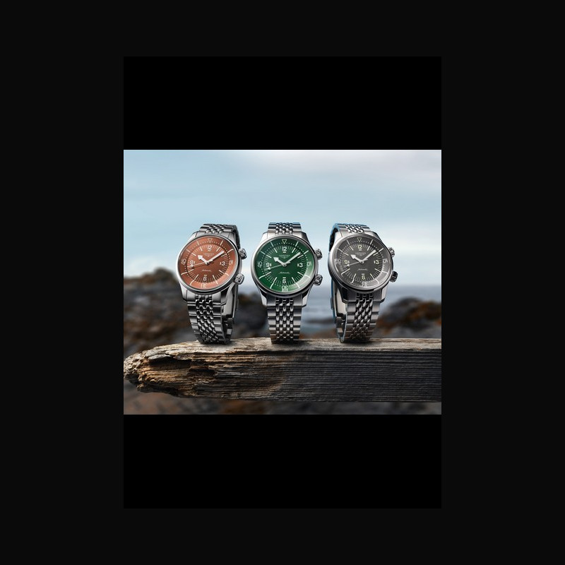 At first glance, it is distinctive because of its two crowns and internal rotating bezel. Presented in 2023 in a completely redesigned version measuring 39 mm in diameter, this year the Longines Legend Diver collection comes with new polished lacquered dials in green, terracotta and anthracite grey.