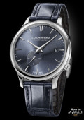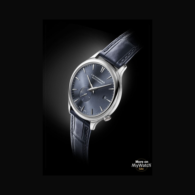 | More characteristics : | Movement Mechanical self-winding L.U.C 96.26-L Number of components 172 Total diameter 27.40 mm Thickness 3.30 mm Number of jewels 29 Frequency 25,200 vph (3.5 Hz) Power reserve 65 hours Functions and displays Central display of the hours and minutes Offset small seconds at 6 o’clock Semi-instantaneous aperture-type date display Case Ethically certified “Fairmined” 18-carat white gold Dial satin-brushed sunburst motif centred on the small seconds Blue-grey galvanic treatment Strap / Buckles Hand-sewn matt blue-grey plant-dyed CITES-certified alligator leather strap, with cognac-coloured alligator leather lining 18-carat white gold pin buckle |