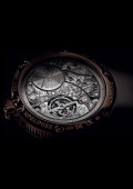 | More characteristics : | Movement Mechanical self-winding movement with a peripheral oscillating weight tourbillon Running equation of time 80-hour power reserve Caliber 581DPE 563 components 16¾ lignes 57 jewels Numbered and signed Breguet Silicon escape wheel and inverted lateral lever with silicon horns Case 18-carat rose gold with fluted caseband Dial Slate-gray dial in gold Day windows between 10 and 11 o’clock Month and year windows between 1 and 2 o’clock Retrograde date on a circular arc running from 9 to 3 o’clock Power-reserve indicator in a window between 7 and 9 o’clock Perpetual calendar Strap / Buckles Brown alligator leather strap with rose gold triple folding buckle |