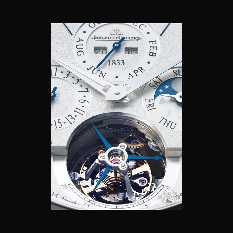 | More characteristics : | Movement New automatic winding mechanical movement. Jaeger-LeCoultre Calibre 985. crafted. assembled and decorated by hand 48-hour power reserve 431 parts 49 jewels 8.15mm thick 30.7mm in diameter Frequency: 28.800 vibrations per hour Functions Hours. minutes. small seconds on the flying tourbillon Perpetual calendar: indication of the date. day. month. year and moon phase Dial Grained silver-toned. transferred baton hour-markers and traditional minute circle Strap Hand-sewn high-end alligator leather 950 platinum pin buckle |