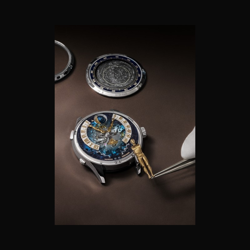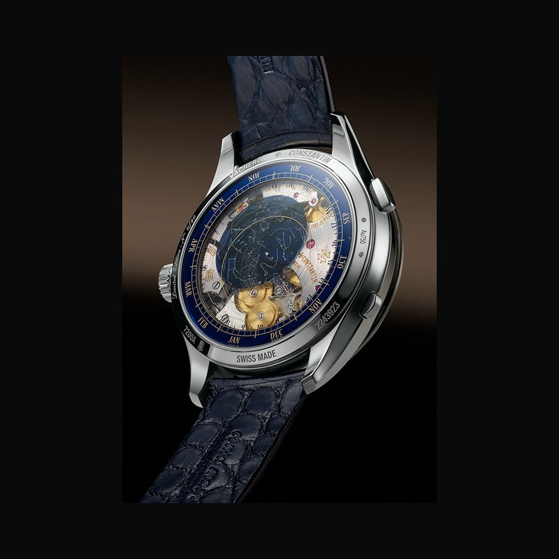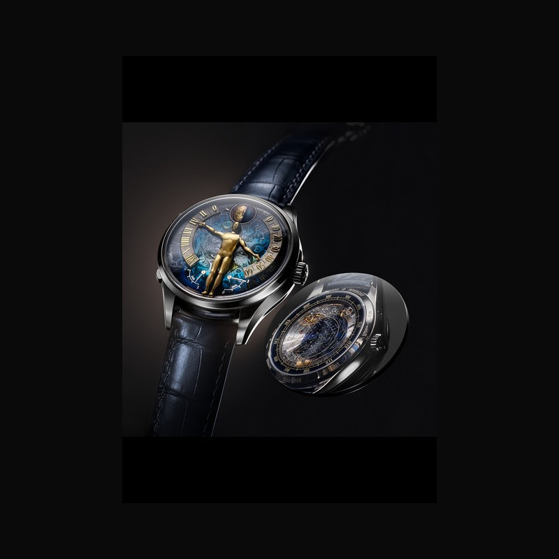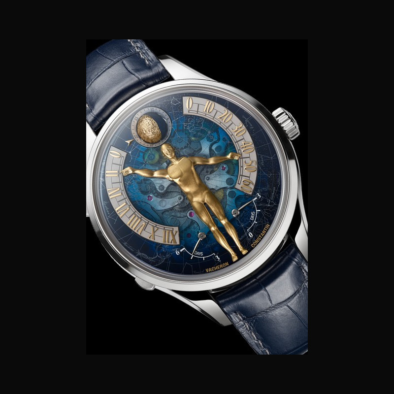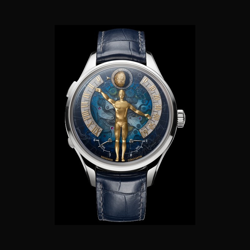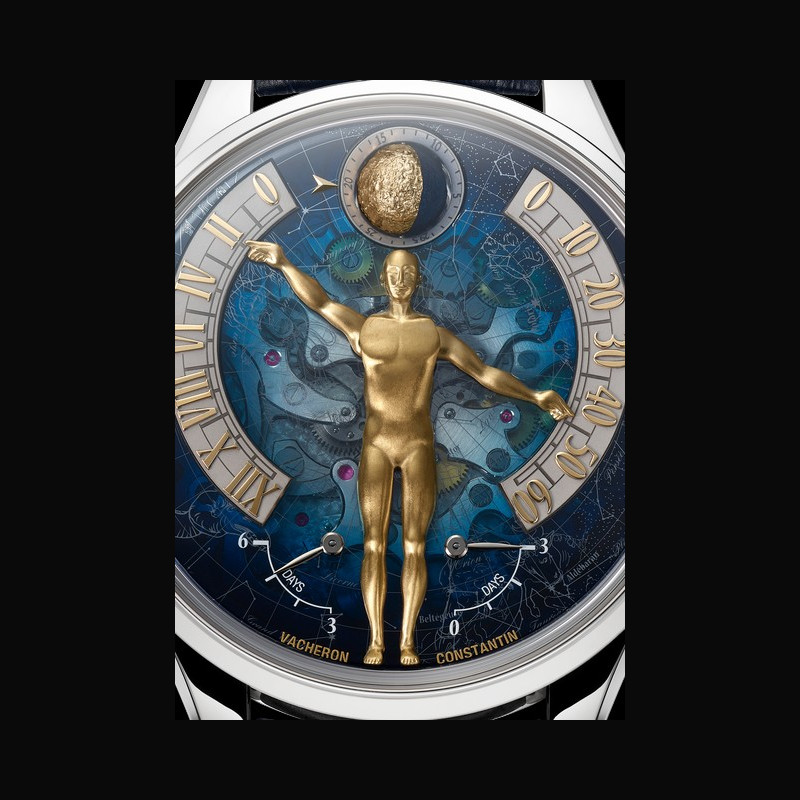 Me dial is dominated by a golden-coloured human figure that closely resembles the ‘Astronomer’ automaton incorporated into La Quête du Temps clock. Me figure appears to be standing in the centre of the cosmos, represented by a graduated blue background decorated with a map of the stars, and a three-dimensional moon overhead. In homage to Vacheron Constantin’s 270th anniversary, the celestial vault reproduces the constellations as they appeared above Geneva on 17 September 1755. To ensure the accuracy of the celestial map, Vacheron Constantin worked with astronomers from the Geneva Observatory, who were able to determine the precise position of each star on that date.