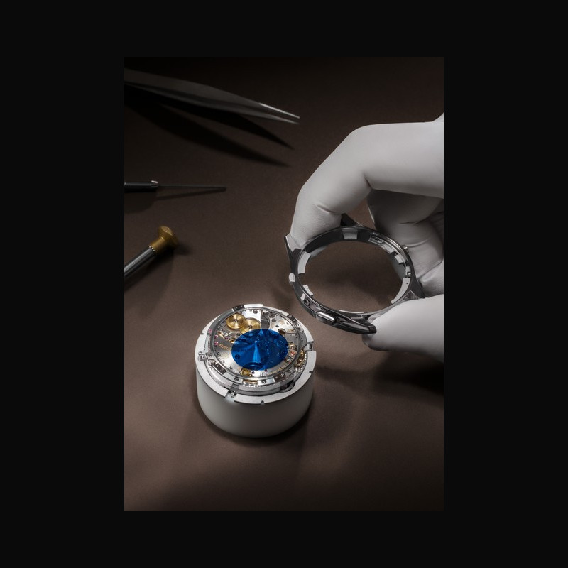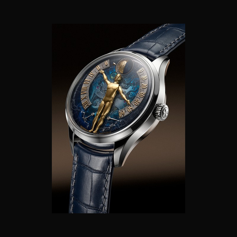 To create this evocative artistic tableau, a variety of different and highly specialised artistic crafts were brought together in a deft marriage of traditional and modern techniques. Me three-dimensional human figure is crafted in titanium with a golden PVD treatment then sandblasted with hand-patina finishing. Me spherical precision 3D moon is made of titanium, hand-engraved and polished; to echo the Moon’s appearance as it cycles through its phases, one side is finished with a golden PVD treatment and the ‘dark’ side is finished with a deep blue PVD treatment. Me arcs for the hour and minute scales are crafted from 18K white gold with an opaline finish, complemented by the 27 applied indexes in 18K 3N yellow gold.