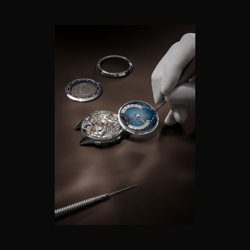 On the back dial – where sidereal time is displayed and the movements of the constellations are tracked in real time – the celestial vault is laser-engraved onto the sapphire crystal case-back. Blue indications are applied by metallisation, yellow indications are transfer-printed and the month names are marked by gold powder transfer.