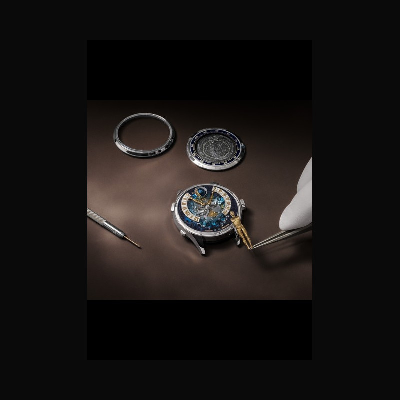 Enhanced by a blend of traditional artistic crafts and modern decorative techniques, the figure is set against a backdrop representing the constellations as seen from Geneva on the day of the Maison’s founding in 1755. It is complemented by a double retrograde power reserve indicator and a 3D precision moon phase with age of the moon. Ne reverse dial features a sky chart that displays the sidereal day and tracks the constellations in real time, accurate to one day of variation in 9,130 years. Conceived as an homage to the 270th-anniversary astronomical clock La Quête du Temps, Métiers d’Art – Tribute to the Quest of Time is presented in a 43mm white gold case and offered in a limited edition of 20 pieces.