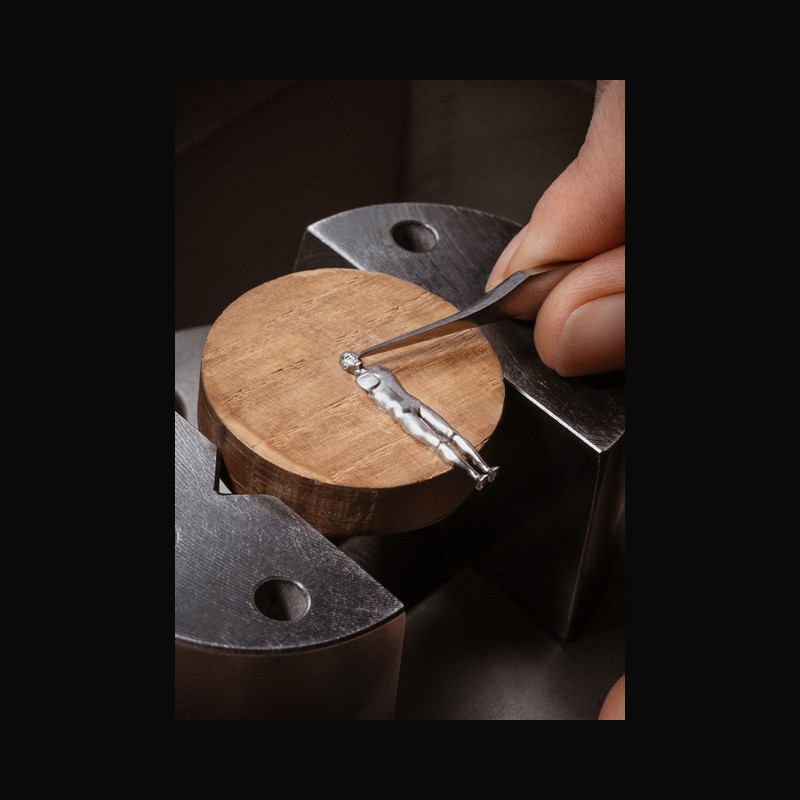 Mis watch was conceived with technique and savoir-faire at the service of artistic expression and blends traditional handcrafts and finishings with modern decorative techniques – the choice of technique being driven by the desired aesthetics. For example, the titanium 3D moon is hand-engraved before finishing with a bi-coloured PVD treatment; the titanium human figure was given a 3N yellow gold treatment before being sandblasted by hand to create a patina finish.