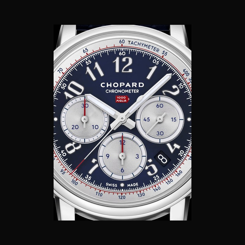 | Display : | Railway track with blue and red transfers Tachymeter scale on silvered bezel with blue transfers Red 1000 Miglia arrow logo in the centre Hour numerals painted with Grade X1 SuperLuminova® Rhodium-plated baton-type hours and minutes hands; painted with Grade X1 SuperLuminova® Snailed chronograph counters with red baton-type hands Snailed small seconds subdial with rhodium-plated baton-type hands Central red baton-type chronograph seconds hand |