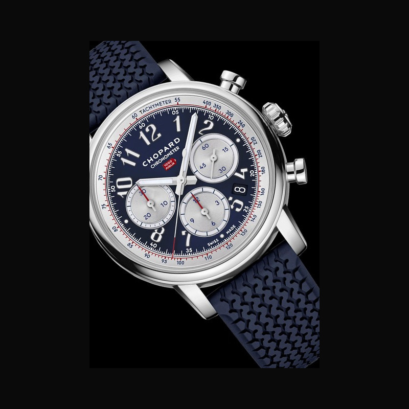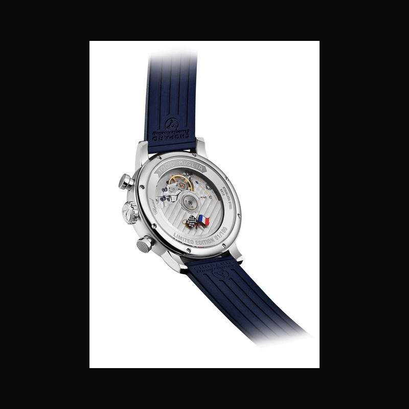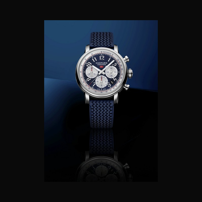 A ‘glass box’ sapphire crystal crowns the dial, amplifying legibility, depth and light for shimmering perspectives. Completing the look, the timepiece is fitted with a blue rubber strap featuring a tyre-tread motif – a creative touch from Chopard, which was among the first Manufactures to use rubber on the straps of Mille Miglia chronographs. This distinctive design underscores the collection’s racing DNA, drawing inspiration from Dunlop tyre models of the 1960s. The sapphire crystal case-back is adorned with crossed flags: one in black-and-white chequered racing, the other in France’s national colours. It reveals the self-winding chronograph movement, certified by the Contrôle Officiel Suisse des Chronomètres (COSC) and offering a 54-hour power reserve.