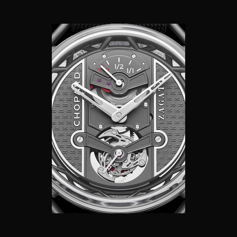 | Display : | Anthracite-coloured ceramicised titanium mainplate adorned with Zagato “Z” motifs in positive relief; rhodium-plated and polished Chopard and Zagato logos; rhodium-plated and polished chamfers Rhodium-plated openworked hours and minutes hands; shaped to evoke racing-car steering wheels with pierced spokes Rhodium-plated baton-style hands for the small seconds and power-reserve indicator Power-reserve indicator in the form of a fuel gauge Ceramicised titanium tourbillon bridge; shaped like the spokes of a racing-car steering wheel |