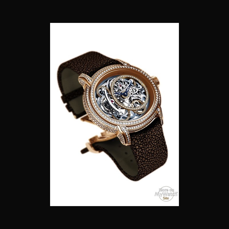 | More characteristics : | Chalcedony mainplate Casing-dimensions : 33.90 x 28.90 mm 15 jewels Frequency : 21 600 vibrations per hour 72 hours power reserve 18-carat pink gold case set with 395 diamonds (~ 3.45 carats) Outer and inner rings in diamond-set 18-carat pink gold |