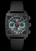 | Display : | 3 counters: - 3 o’clock: black turquoise opalin minute chronograph counter; red lacquered hand - 6 o’clock: permanent second indicator; black lacquered hand - 9 o’clock: black turquoise opalin hour chronograph counter; red lacquered hand Machined indexes turquoise lacquered with blue Super-LumiNova® Black gold-plated facetted hour and minute hands with light blue Super- LumiNova® Red lacquered central hand Rhodium plated TAG HEUER applied logo 6 o’clock date with blue Super-LumiNova® MONACO SWISS MADE printed |