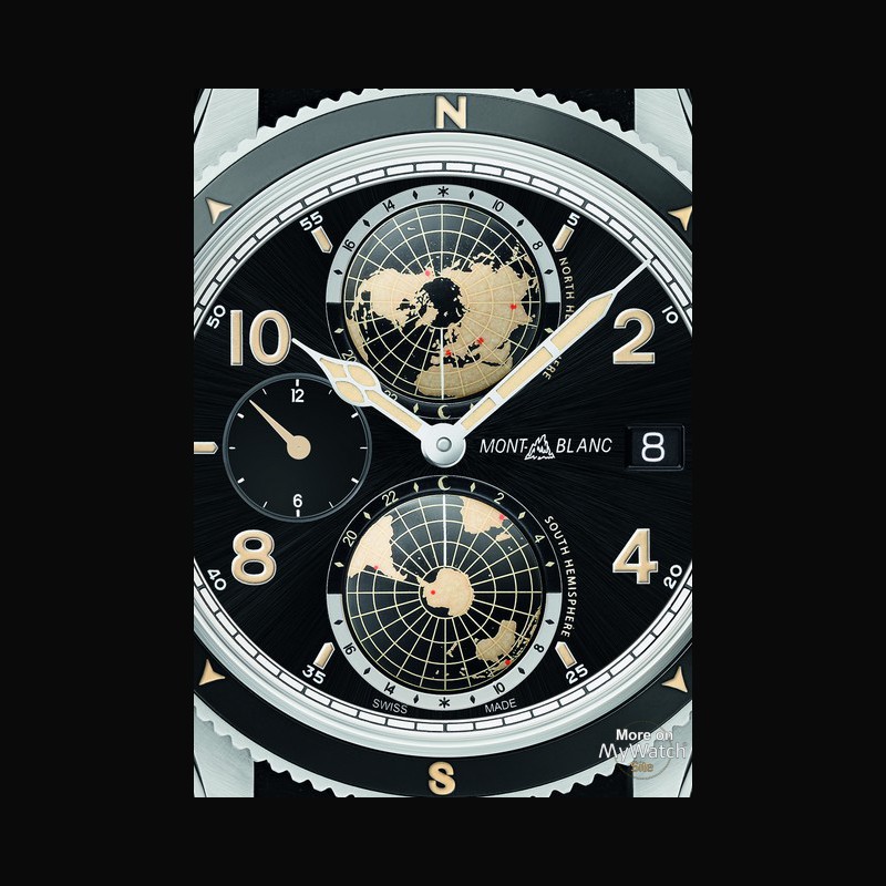 The timepiece comes in two versions, with a stainless steel case or a limited edition bronze case. Both feature polished and satin finishing as well as vintage fluted crowns with the Montblanc emblem in relief. A new bidirectional stainless steel or bronze bezel with shiny black ceramic completes the design. The bezel is also fluted on the flank for a better grip and features the four cardinal points which have been engraved.